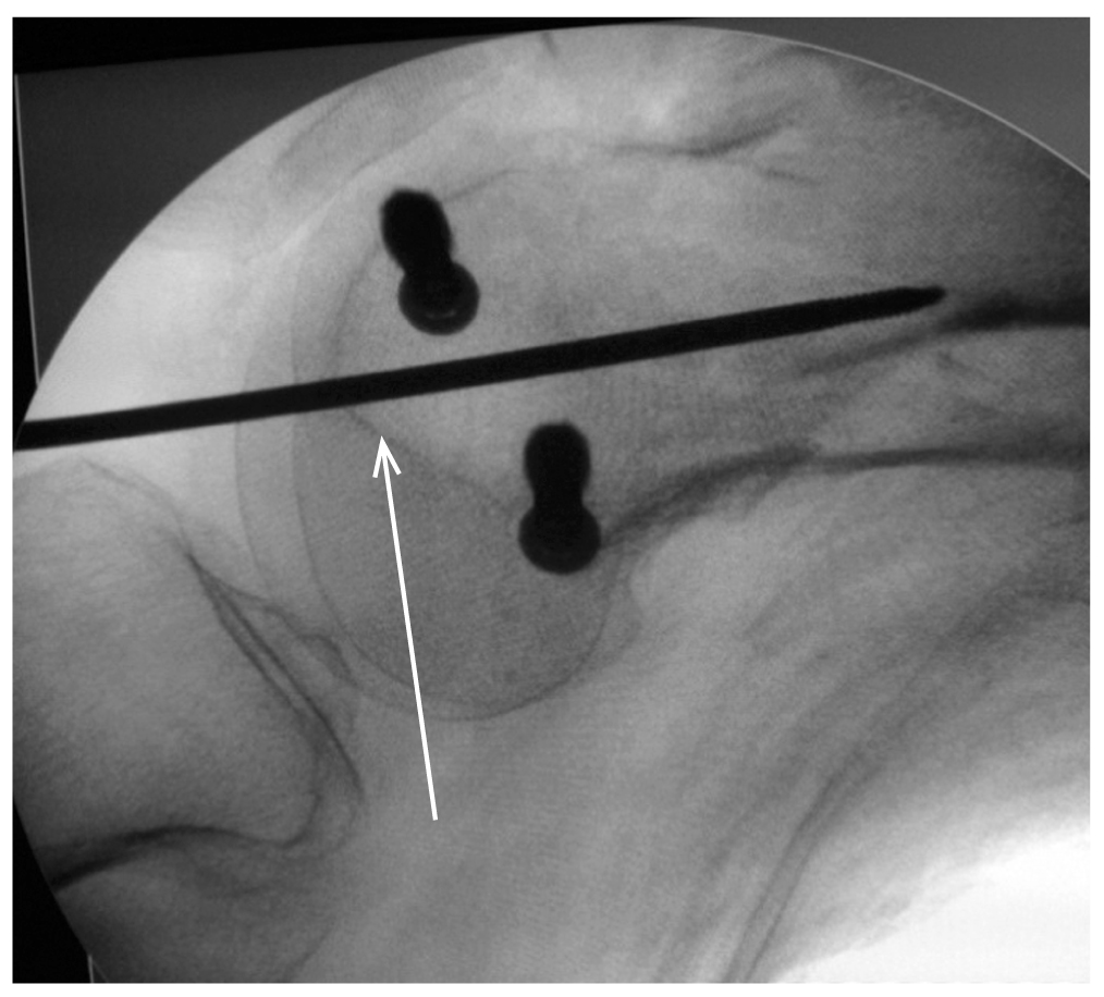 Рис. 6. Точка введения направляющей спицы (стрелка) в боковой проекции над линией Blumensaat. / Fig. 6. The point of the guiding wire entry in the lateral view superior to the Blumensaat line.