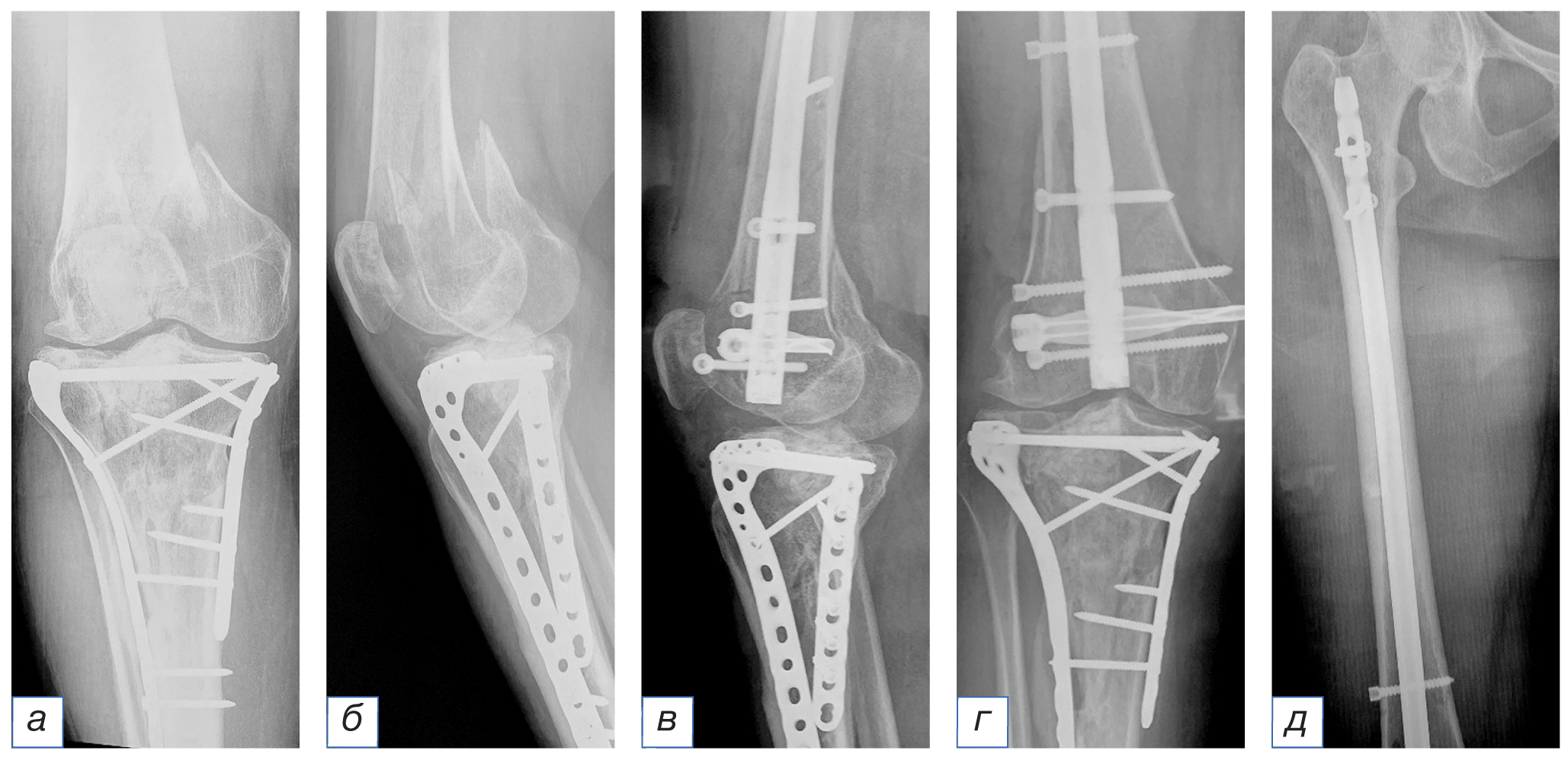 Рис. 7. Рентгенограммы пациентки 62 лет с диагнозом закрытого оскольчатого перелома дистального отдела правой бедренной кости до операции (а) и после оперативного лечения (б–д). / Fig. 7. Radiographs of the 62-year-old patients with a diagnosis of a closed comminuted fracture of the distal right of femoral bone before (а) and after the surgery (б–д).