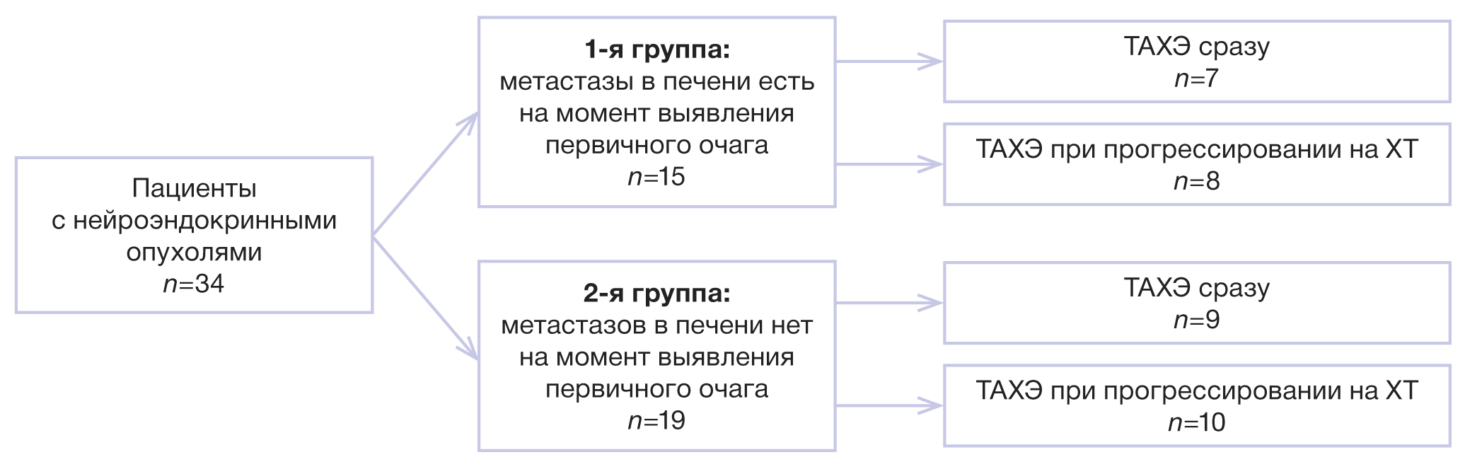 Рис. 1. Дизайн исследования. Примечание. ТАХЭ — трансартериальная химиоэмболизация печеночных артерий; ХТ — химиотерапия. / Fig. 1. Study design. Note: ТАХЭ — transarterial chemoembolization of hepatic arteries; ХТ — chemotherapy.