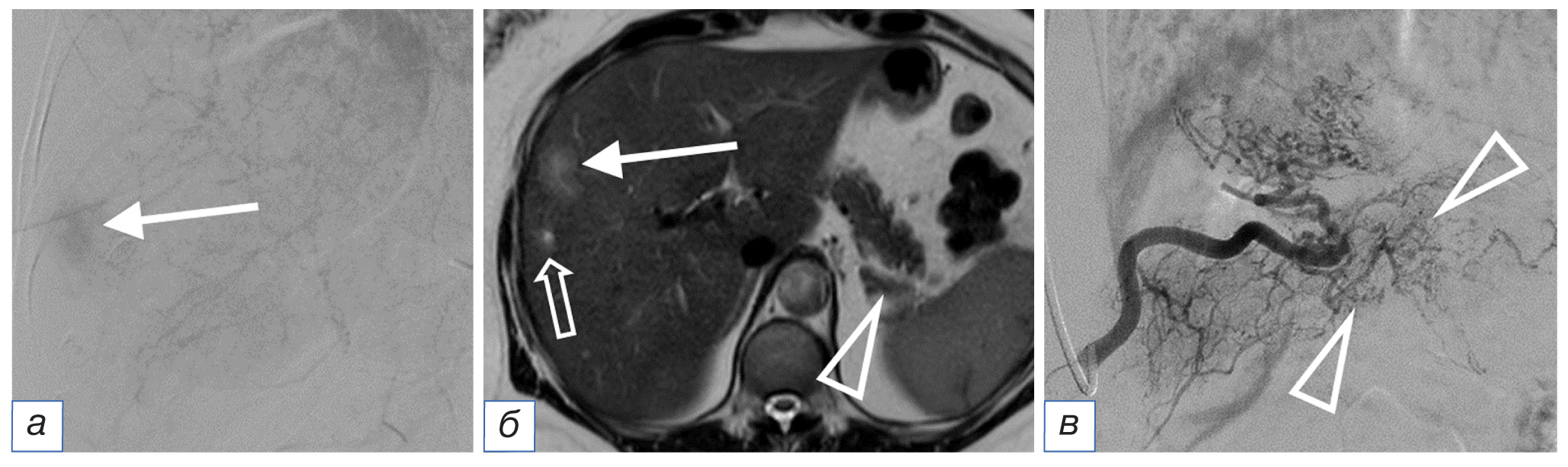 Рис. 2. Ангиография (а): интенсивное контрастирование метастаза диаметром 3 см (стрелка); магнитно-резонансная томография (б): тот же метастаз диаметром 3 см с щелевидным некрозом в структуре (длинная стрелка), инфильтративный метастаз диаметром 0,5 см с локально расширенным желчным протоком в центре (объемная стрелка), опухоль хвоста поджелудочной железы (треугольная стрелка); ангиография опухоли поджелудочной железы (в): разветвленная сеть афферентов (треугольные стрелки). / Fig. 2. Angiography (а): intense contrast of a metastasis with a diameter of 3 cm (white arrow); magnetic resonance imaging (б): the same metastasis with a diameter of 3 cm with slit necrosis in the structure (long arrow), an infiltrative metastasis with a diameter of 0.5 cm with a locally expanded bile duct in the center (3D arrow), the pancreatic tail tumor (triangular arrow); angiography of the pancreatic tumor (в): branched network of afferents (triangular arrows).