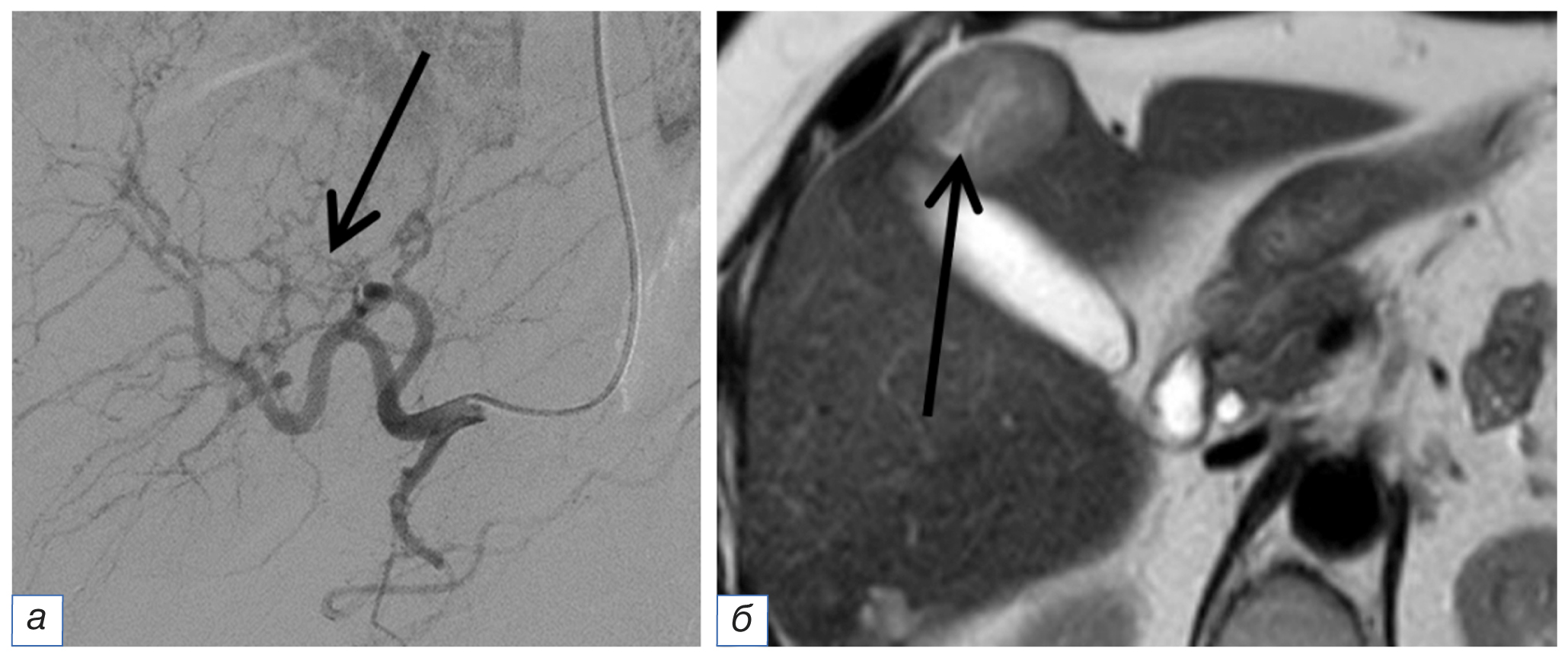 Рис. 3. Тот же пациент. Ангиографическая картина другого метастаза диаметром 3 см (а): несколько тонких перекалиброванных сосудов (стрелка), отходящих в нетипичном месте; магнитно-резонансная томография того же метастаза (б): щелевидный некроз в структуре (стрелка). / Fig. 3. The same patient. Angiographic picture of another metastasis with a diameter of 3 cm (а): several thin recalibrated vessels (arrow) exiting in an atypical place; magnetic resonance imaging of the same metastasis (б): slit necrosis in the structure (arrow).