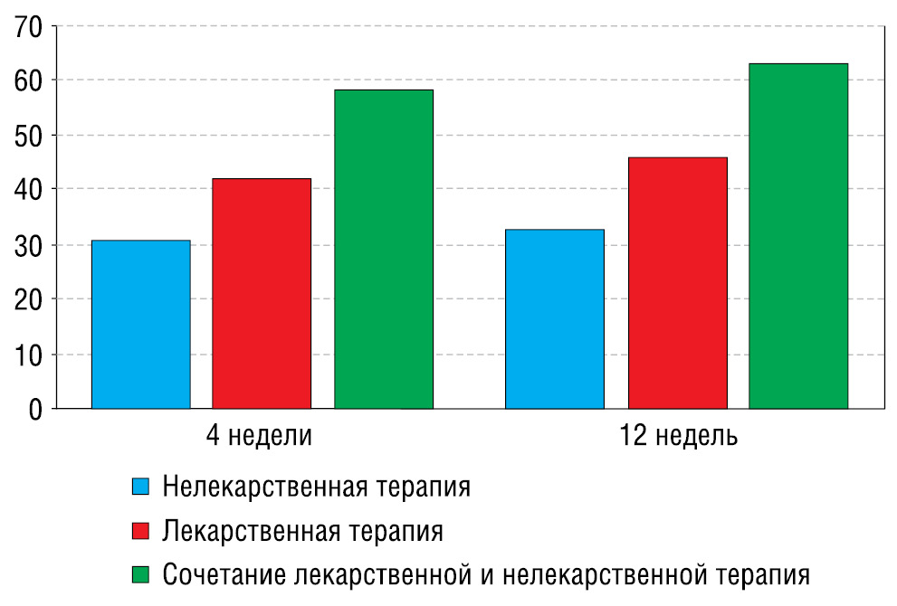 Несмотря на то, что в специализированных центрах головную боль лечат давно, остается высоким процент пациентов, неудовлетворенных терапией [37]. Удовлетворенность пациентов различными схемами лечения в Клинике головной боли и вегетативных расстройств им. академика Александра Вейна приведена на рис. 3.