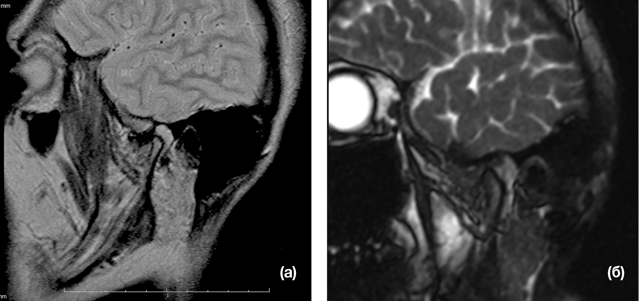Рис. 1. Магнитно-резонансная томограмма височно-нижнечелюстного сустава с невправляемым смещением суставного диска: до (а) и после (б) лечения