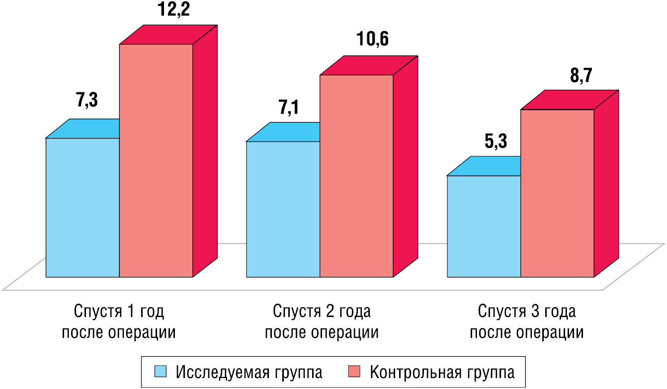 Спустя 2 года после операции ранний демпинг-синдром (от англ. dumping — сброс) диагностирован у 14,3 и 21,3% пациентов основной и контрольной групп. Исследование показало, что выбор метода реконструкции пищеварительного тракта влияет на характер усвоения основных ингредиентов принимаемой пищи (табл. 3).