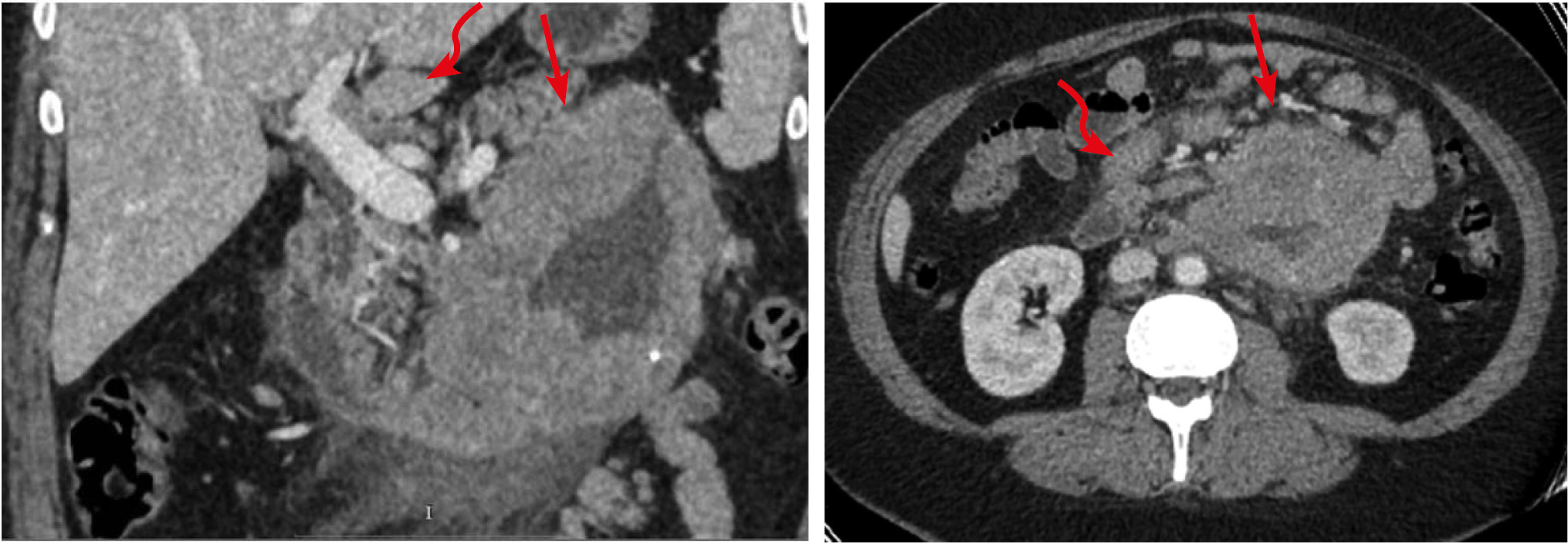 Примечание. В 4-й части двенадцатиперстной и проксимальном отделе тощей кишок определяется утолщение стенки до 40 мм и неравномерное расширение просвета за счет разрастания опухолевой ткани (прямые стрелки). Опухолевые разрастания имеют равномерную солидную структуру, которая при внутривенном контрастировании однородно накапливает контрастный препарат. По интенсивности накопления ткань опухоли изоденсивна с неизмененной стенкой кишки. Лимфатические узлы брыжейки и забрюшинного пространства увеличены (изогнутые стрелки).