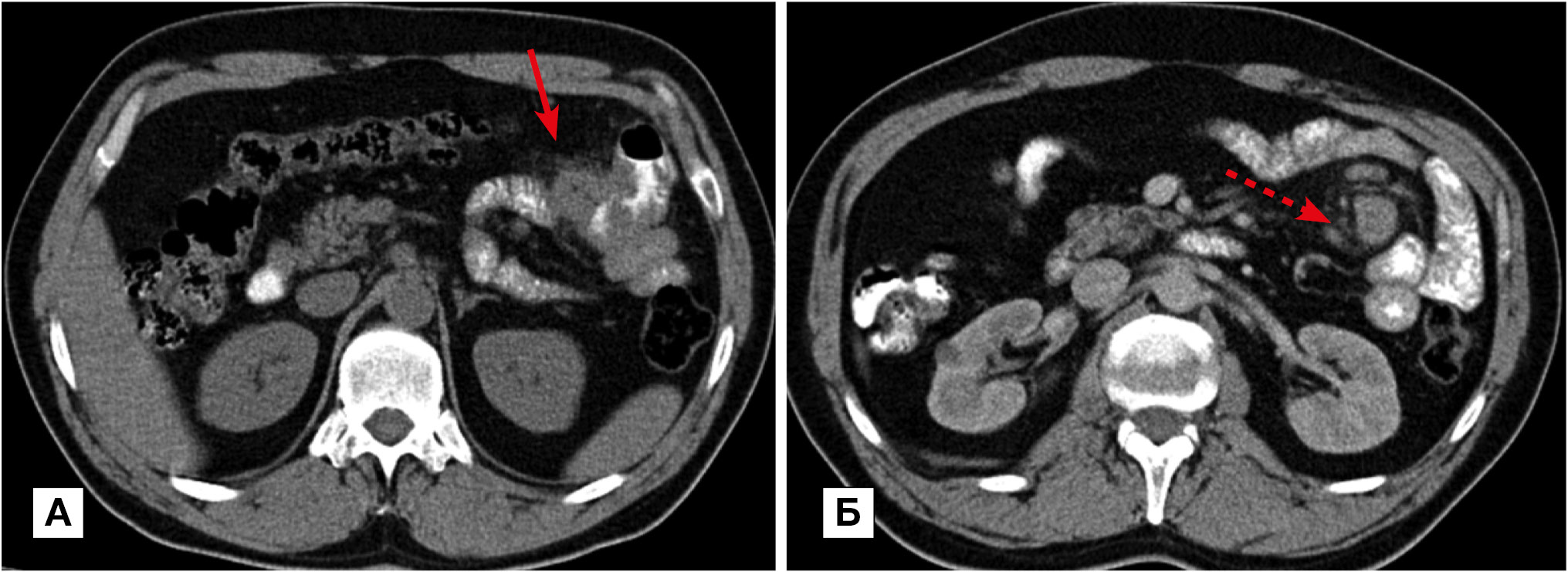 Примечание. А — аксиальная томограмма, Б — сагиттальная реконструкция. Стенка тощей кишки на протяжении ~150 мм утолщена до 10 мм. Просвет кишки неравномерно сужен. Контрастное усиление стенки трансмуральное, изоденсивное с остальными отделами кишки (стрелки). Имеется уплотнение прилежащей части брыжейки за счет десмопластической реакции (пунктирная стрелка).