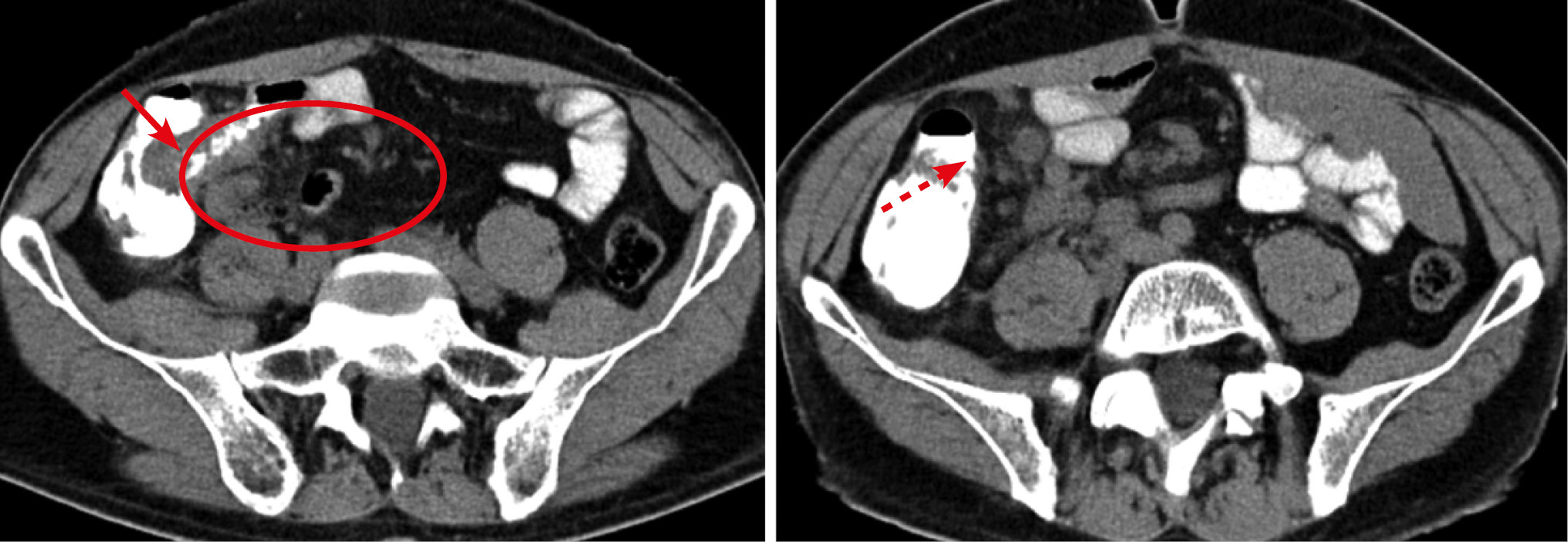 Примечание. Определяется сегментарное утолщение стенки ТК (стрелки) и нисходящей ободочной кишки (пунктирная стрелка). При контрастном усилении наблюдается трансмуральное контрастное усиление стенки и усиление сосудов брыжейки (обозначено кругом).