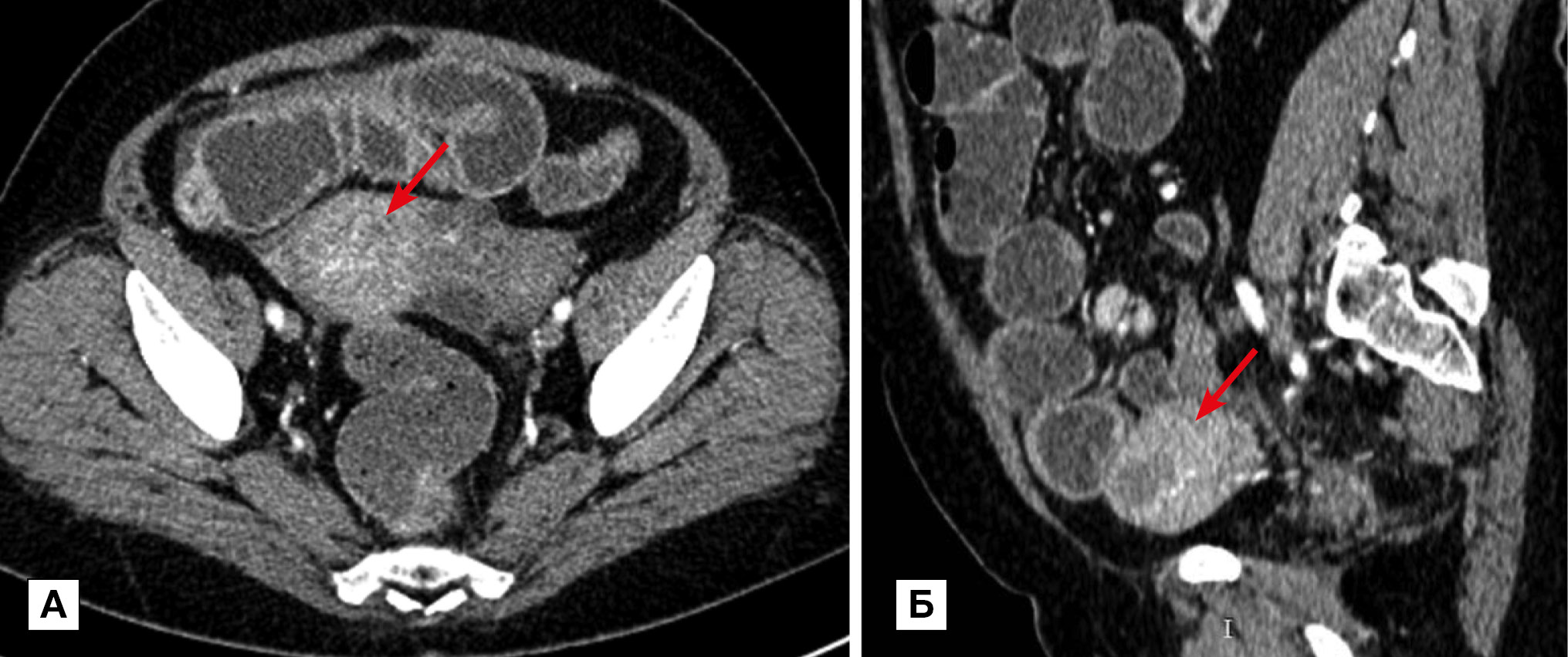 Примечание. А — аксиальная томограмма, Б — сагиттальная реконструкция томограммы. Артериальная фаза контрастного усиления. В дистальном отделе подвздошной кишки на протяжении 10 см определяется экзофитное образование, суживающее просвет (стрелки). Опухоль трансмурально накапливает контрастный препарат. В тонком кишечнике имеются признаки компенсированной тонкокишечной непроходимости.