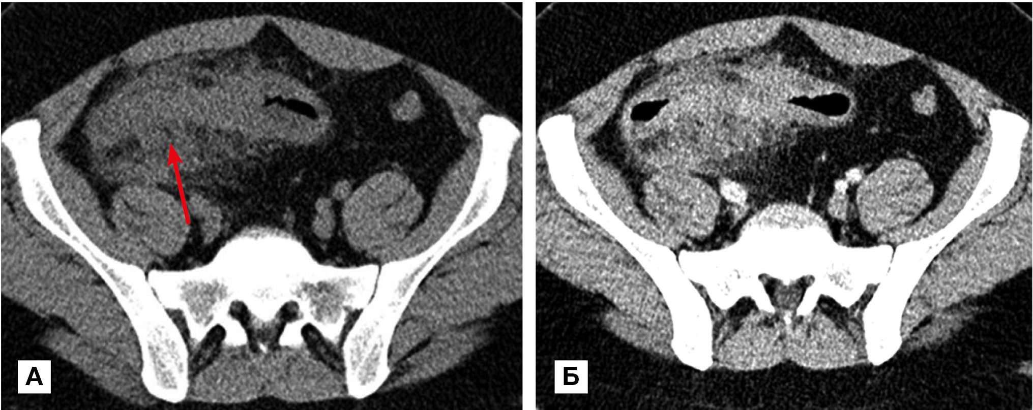 Примечание. А — нативное исследование, Б — артериальная фаза контрастного усиления. По брыжеечному краю стенки подвздошной кишки наблюдается сегментарное утолщение стенки (стрелка), которое при контрастном усилении накапливает контрастный препарат равномерно и трансмурально. В прилежащей части брыжейки определяется разрастание элементов опухолевой ткани.
