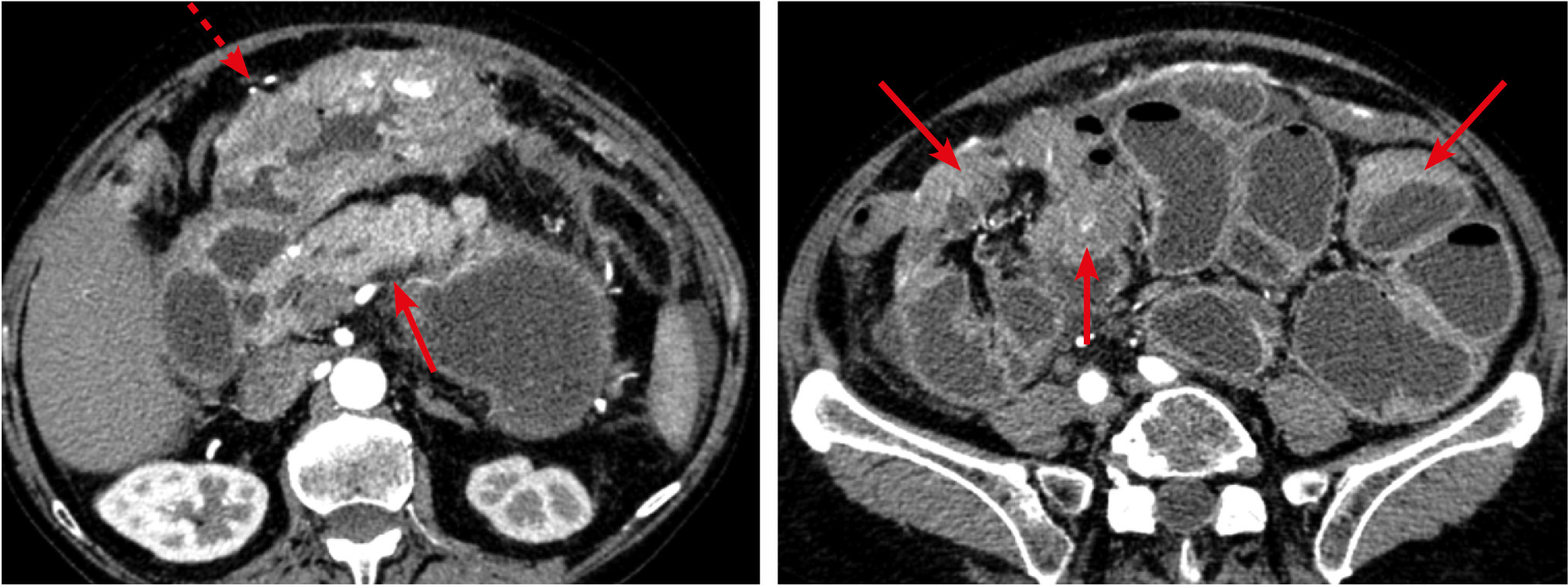 Примечание. А — исследование с контрастированием просвета кишки per os. Б — артериальная фаза контрастного усиления: в стенке тощей кишки определяются мягкотканные узловые разрастания, суживающие и деформирующие просвет кишки; признаков кишечной непроходимости нет. Уплотнение прилежащего отдела брыжейки без признаков десмопластической реакции (стрелка). В брыжейке — увеличенные лимфатические узлы (пунктирная стрелка).