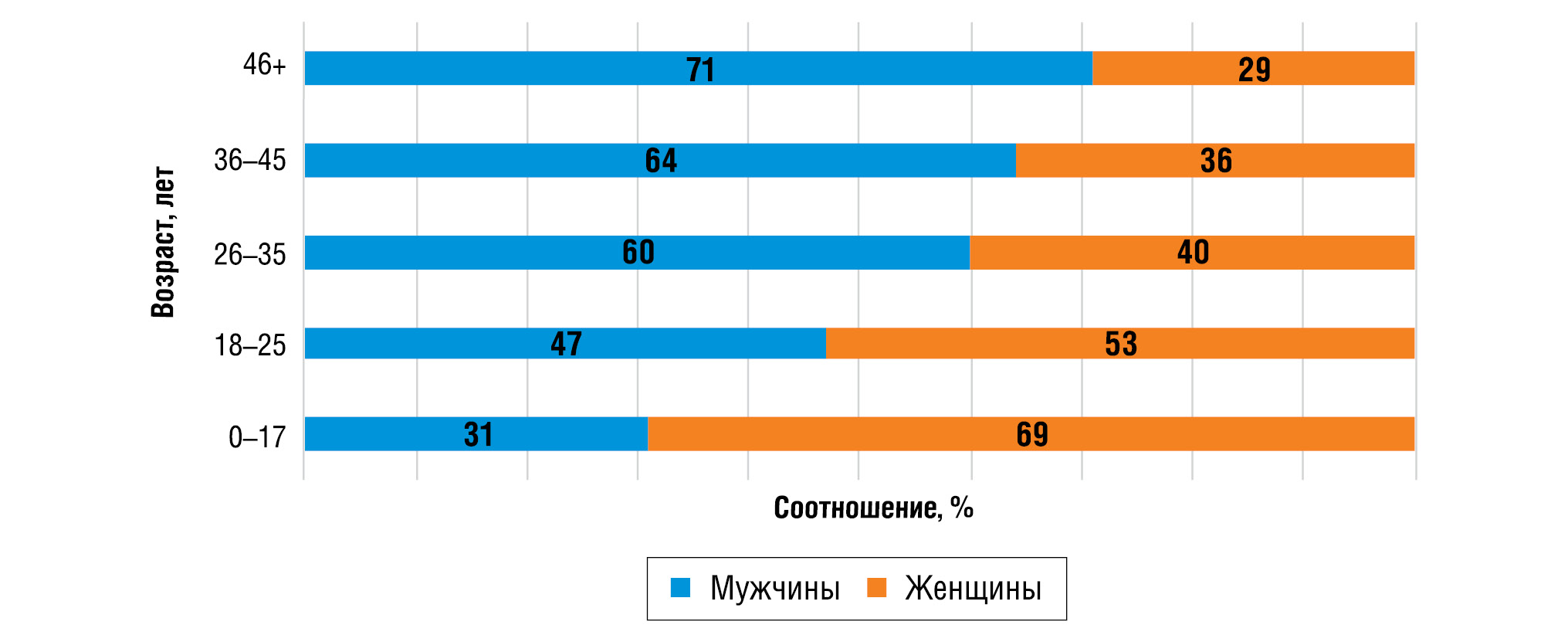 Распределение по полу в группах изменялось разнонаправленно (рис. 2): если в группе 0–17 лет преобладали женщины (69% женщин и 31% мужчин), то в возрастной группе 46 лет и старше — мужчины (29% женщин и 71% мужчин).