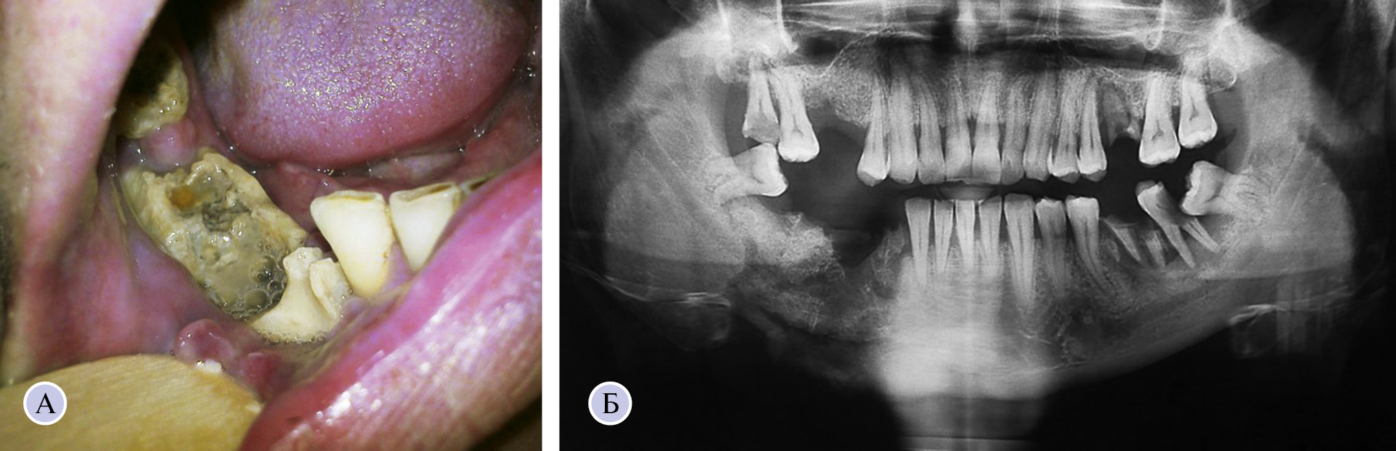 Рис. 1. Изменения в полости рта (А) и на ортопантомограмме (Б) при токсическом остеонекрозе нижней челюсти
