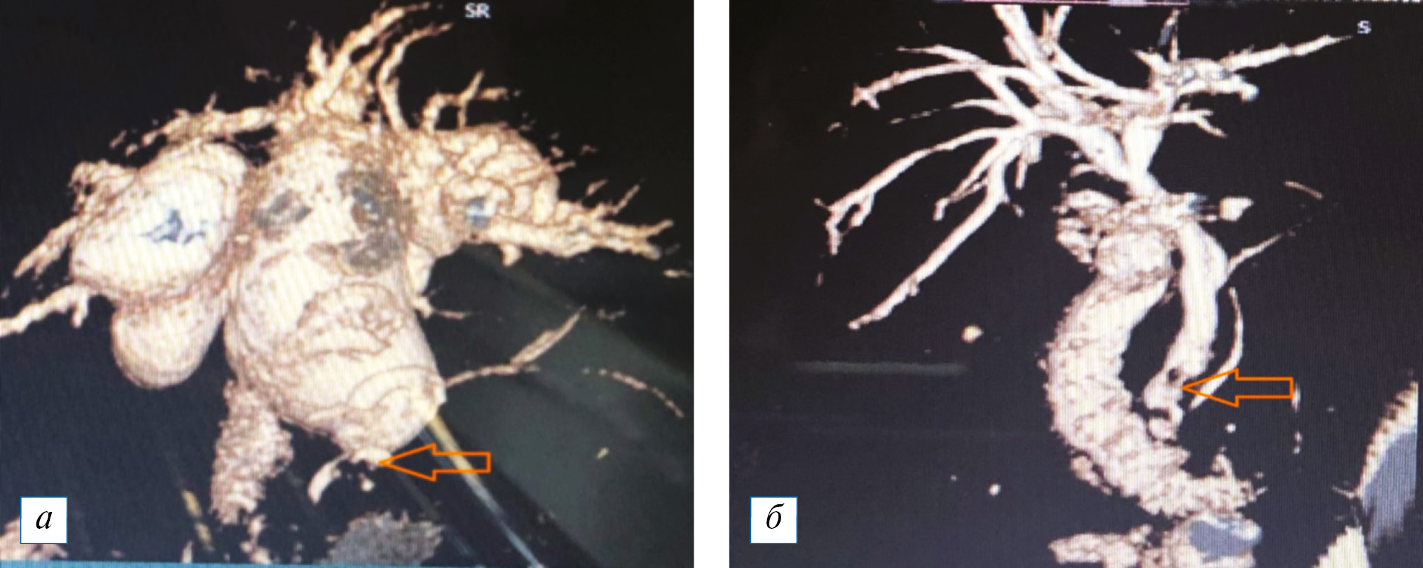 2. Fig. 1. Magnetic resonance cholangiogram, 3D-reconstruction: а — periampular tumor (arrow); б — a concretion in the bile duct (arrow).