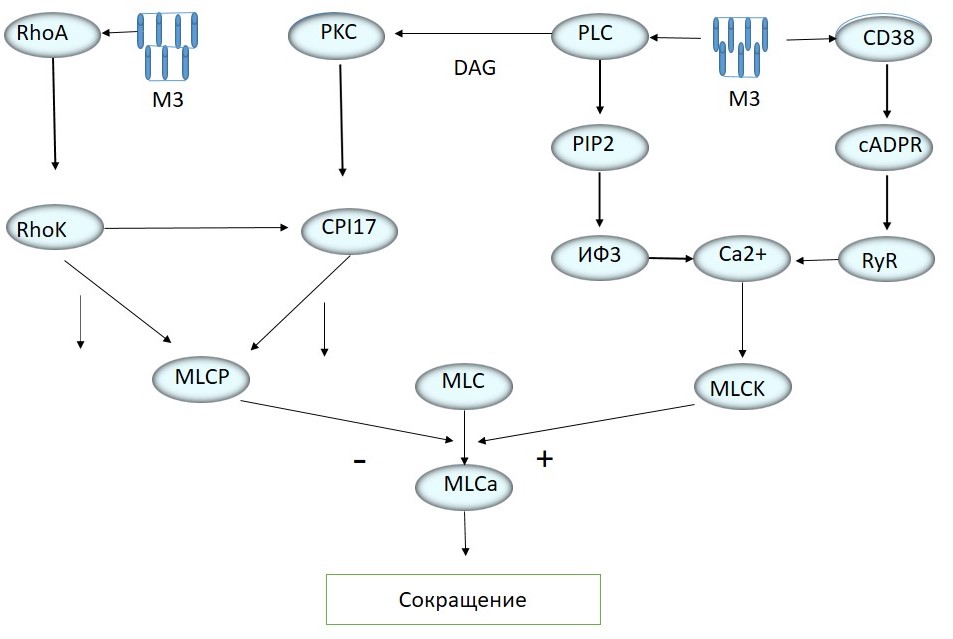 M3-ацетилхолиновые рецепторы, которые расположены на поверхности гладкой мускулатуры, являются основными структурами, которые отвечают за сокращение и поддержание тонуса гладкой мускулатуры дыхательных путей. Мускариновые ацетилхолиновые рецепторы M3 соединены с гетеротримерным белком Gq. Связывание ацетилхолина с рецептором способствует изменению конформации рецептора, что приводит к активации Gq. Высвобожденная субъединица Ga Gq активирует фосфолипазу C, которая гидролизует фосфатидилинозитол в инозитолтрифосфат и диацилглицерин. Выделение диацилглицерина запускает синтез протеинкиназы, что ведет к каскаду множественных биохимических реакций. Активация инозитолтрифосфата приводит к выходу кальция из саркоплазматического (эндоплазматического) ретикулума, выделению Са-зависимой протеинкиназы и развитию сокращения. Возбуждение М3ХР активирует рецептор CD38 через не определенные пока еще механизмы, что способствует выработке циклической аденозиндифосфорной рибозы и высвобождению Ca2+ через каналы рианодиновых рецепторов. Высвобождение Ca2+ увеличивает свободный цитозольный Ca2+ и способствует кальмодулинзависимой активации киназы легкой цепи миозина (myosin light chain kinases, MLCK). MLCK приводит к фосфолированию легкой цепи миозина и сокращению гладкой мускулатуры бронхов. В то же самое время активированные протеинкиназы и Rho-киназа (нижестоящий эффектор RhoA), которые активируются не только M3ХР, но и другими Gq-связанными GPCR, расположенными в гладкой мускулатуре дыхательных путей, подавляют фосфатазу легкой цепи миозина (myosin light chain phosphatase, MLCP), что ведет к увеличению выраженности бронхоконстрикции. Путь данного взаимодействия можно описать следующим образом. Протеинкиназа и Rho-киназа активируют белок CPI-17, который блокирует выработку MLCP. MLCP же ограничивает сокращение, препятствуя MLCK-индуцированному фосфорилированию MLC. Таким образом, подавление выработки MLCP является ключевым механизмом, опосредующим «сенсибилизацию кальцием», что позволяет поддерживать сокращении гладкой мускулатуры дыхательных путей при снижении уровня внутриклеточного кальция и повышать чувствительность ткани к сократительным агентам (ключевой механизм, опосредующий гиперреактивность дыхательных путей у астматиков) (рис. 1) [6].