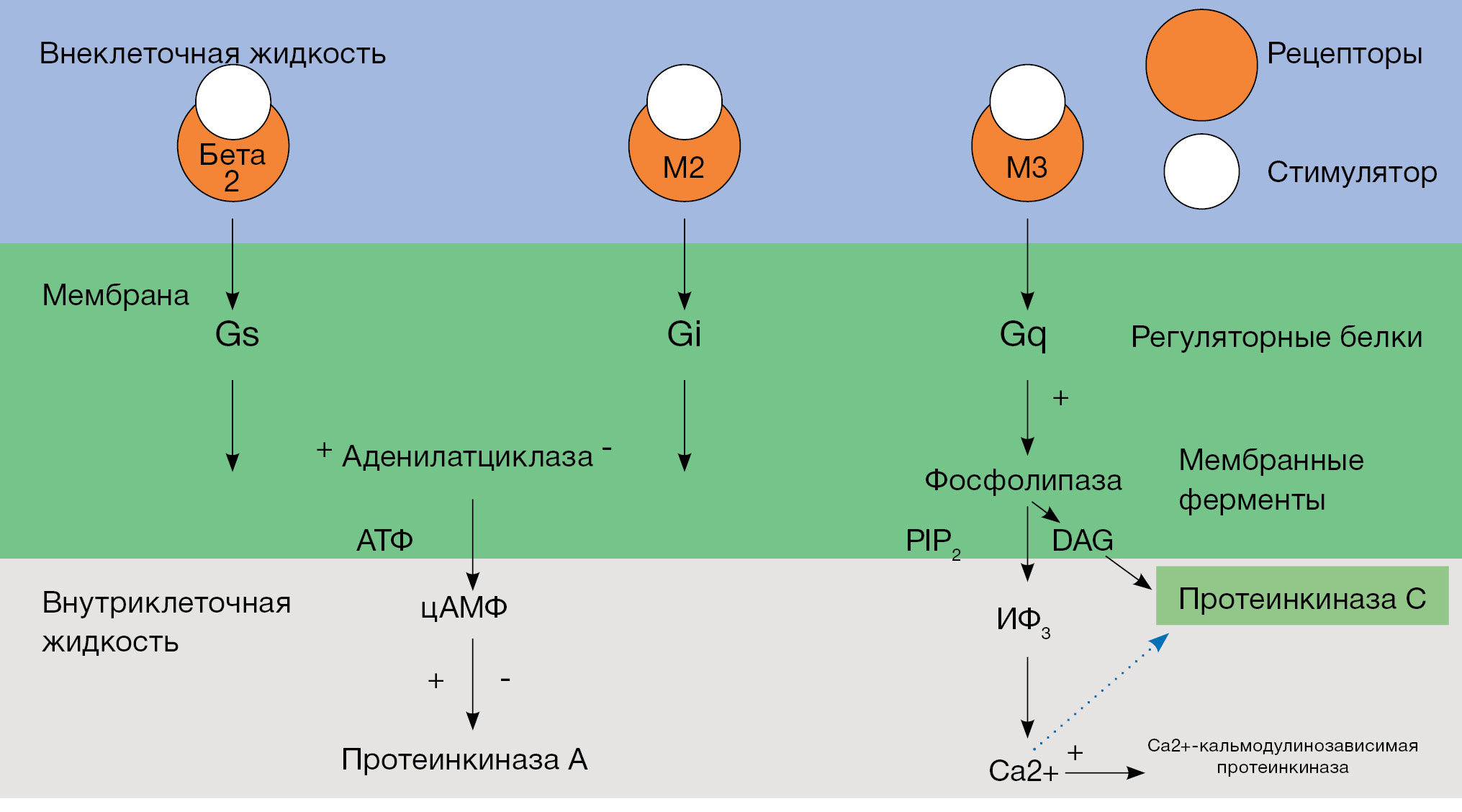 Рис. 2. Взаимодействие бета2-адренорецепторов, М2- и М3-холинорецепторов