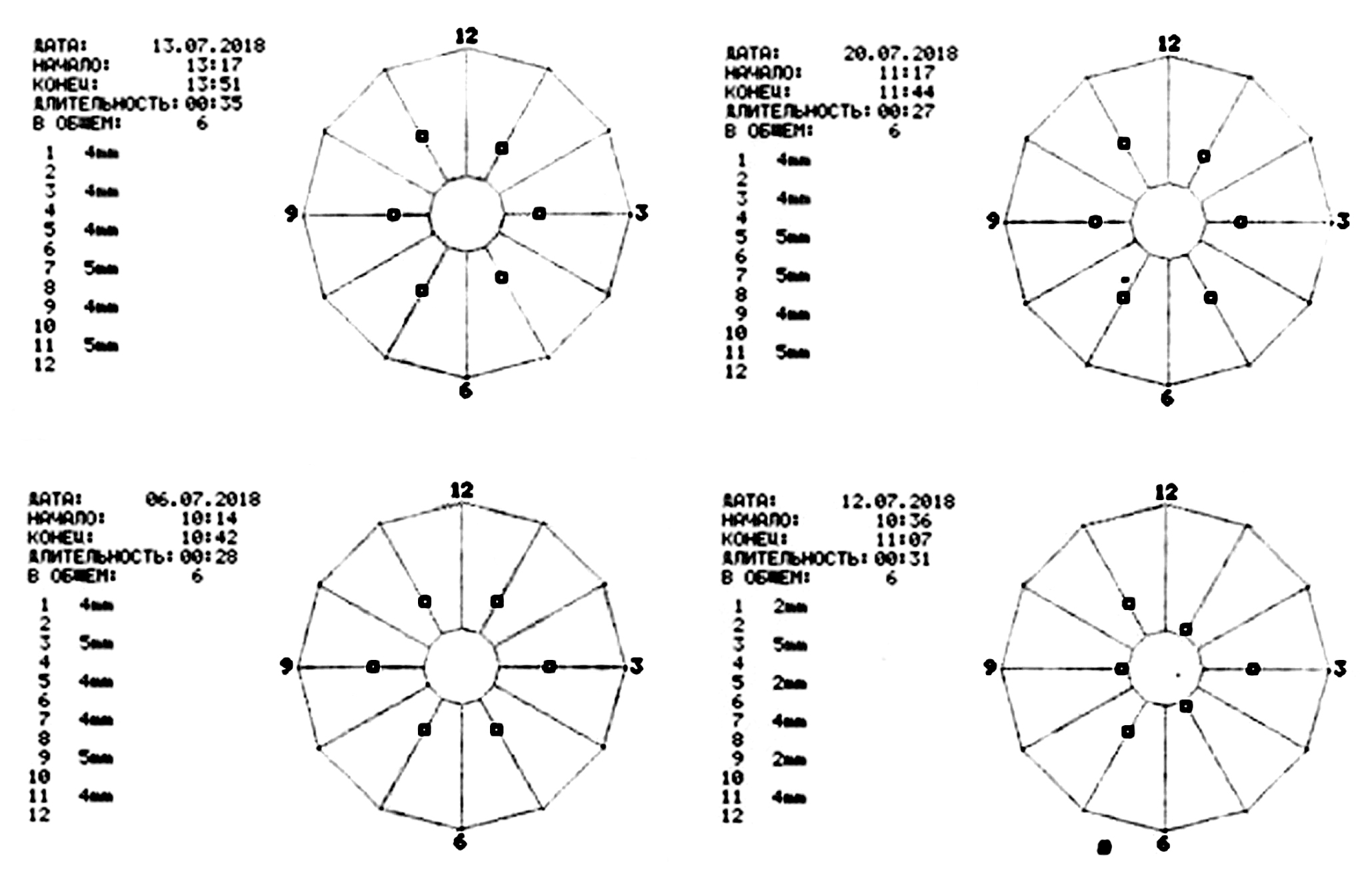 Рис. 1. Число и локализация геморроидальных артерий у 4 пациентов: пример данных, предоставляемых аппаратом HAL-Doppler 2.