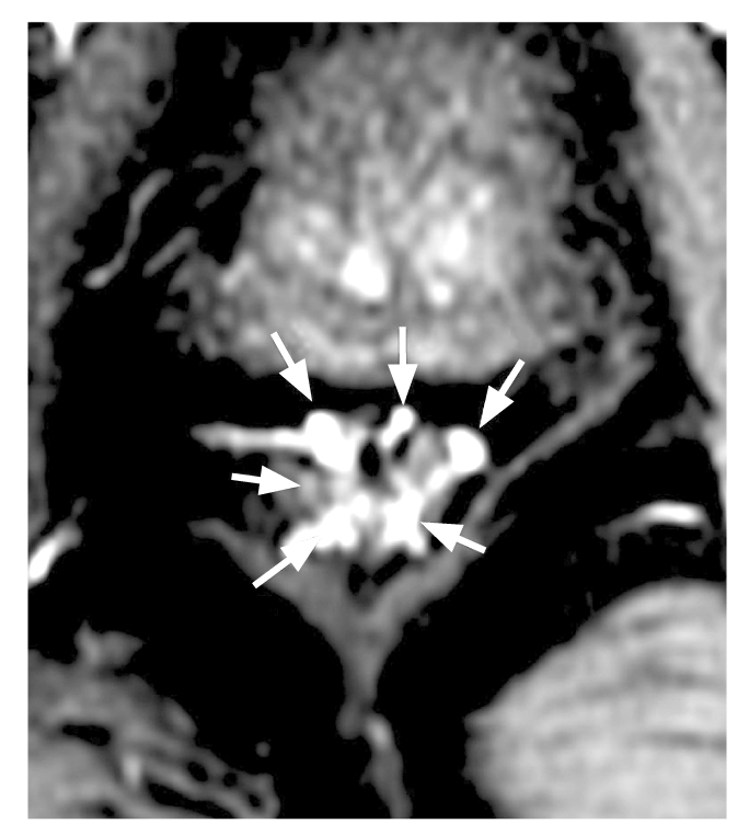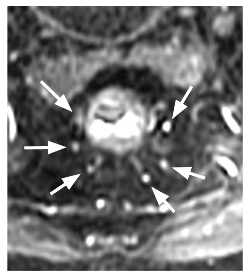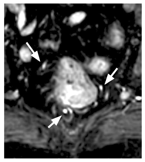 Рис. 2. Магнитно-резонансная томография: визуализировано 6 терминальных ветвей верхней прямокишечной артерии, локализованных на 1, 3, 5, 7, 9 и 11 часах условного циферблата.