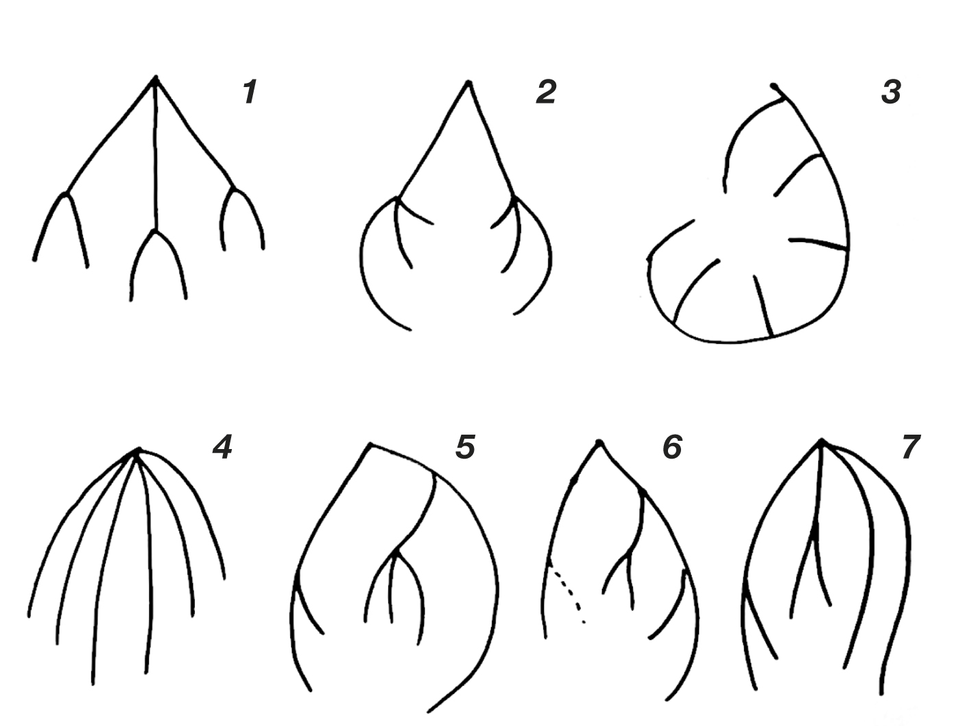 Во всех случаях, пригодных для интерпретации, определялось по 6 терминальных ветвей верхней прямокишечной артерии, локализованных на 1, 3, 5, 7, 9 и 11 часах условного циферблата (рис. 2). Следует отметить большое (7) число выявленных анатомических вариантов ветвления верхней прямокишечной артерии и способа достижения стенки прямой кишки (рис. 3, табл. 1). При этом на классический вариант ветвления верхней прямокишечной артерии на 3 ветви с последующей бифуркацией каждой приходилось 54% случая (на рис. 3 это, соответственно, 1, 5 и 6-й варианты); рис. 4, 5.