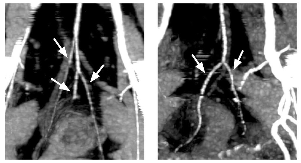 Рис. 6. Трифуркация верхней прямокишечной артерии слева и бифуркация верхней прямокишечной артерии справа (стрелки). Реконструкция компьютерной томографии.