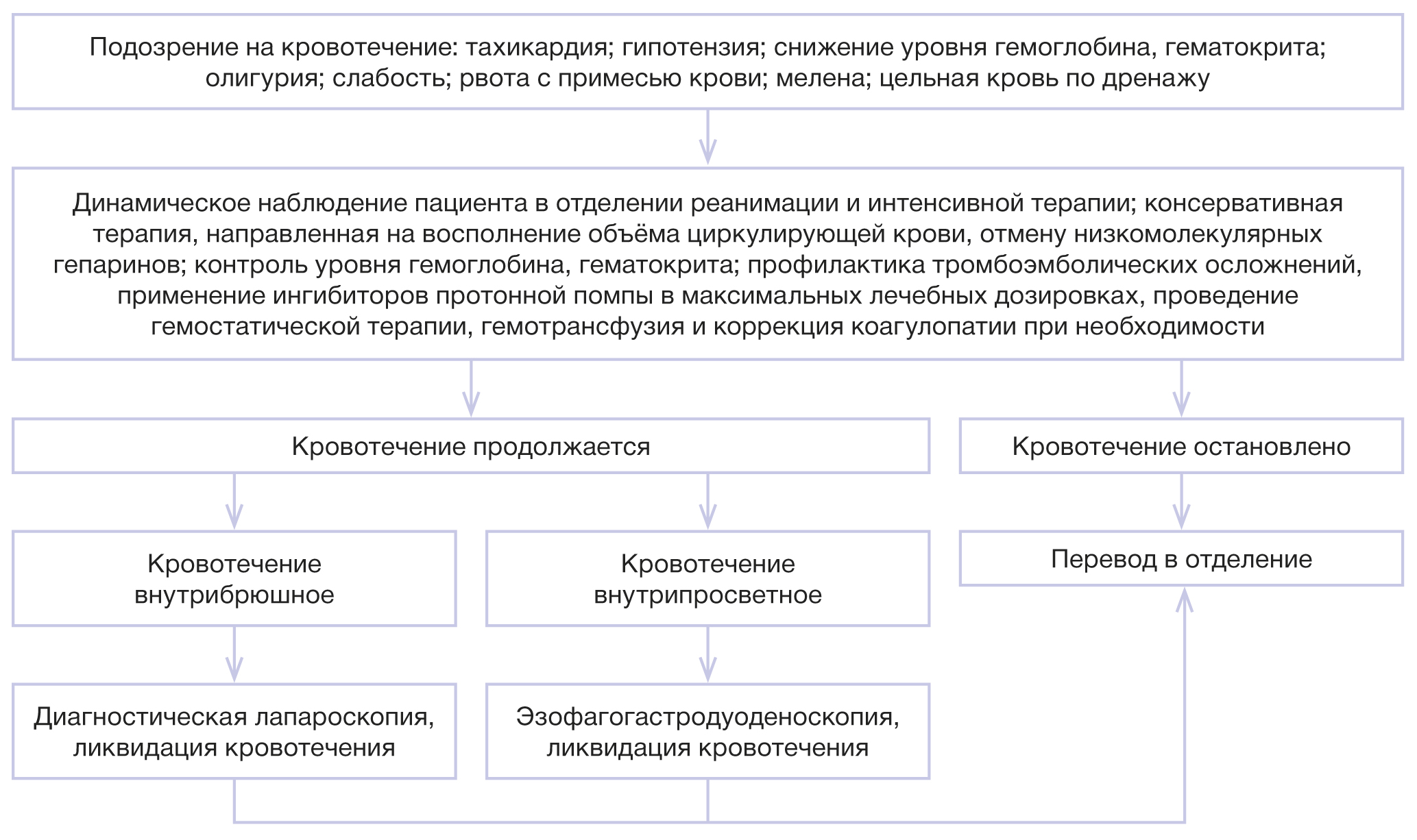 Развитие мелены и рвоты с примесью крови отмечено у 6/14 (43%) пациентов, поступление крови по дренажу — у 8/14 (57%). В 4 (29%) наблюдениях развитию кровотечения предшествовало повышение артериального давления до 180–200/100–110 мм рт.ст. При изучении лабораторных показателей крови у всех 14 пациентов выявлено снижение уровня гемоглобина: у 6 (43%) — не ниже 100 г/л (но более чем на 20% от исходного уровня гемоглобина), у 8 (57%) — ниже 100 г/л. Важной особенностью является то, что ни у одного пациента на этапе диагностики не выявлено перитонеальных симптомов.