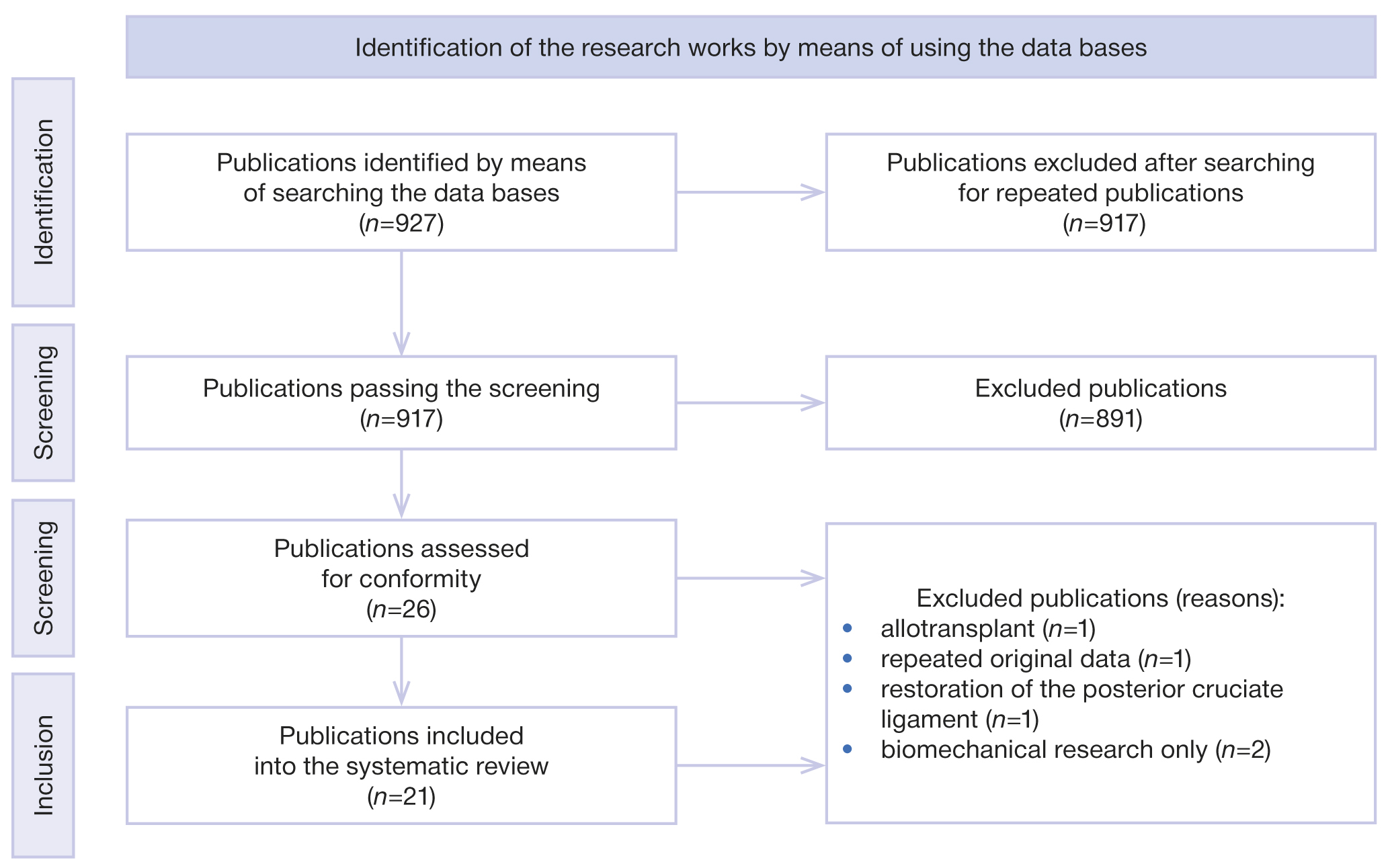 Initially, as a result of literature search, a total of 927 articles were found (Fig. 1) [23]. After excluding the duplicate publications, 917 articles were remaining, while after screening the titles and abstracts — 26articles were obtained, the full texts of which were verified for conformity to the inclusion criteria. All the selection criteria after the double-staged screening were met by 21 articles [24–43]: 16 articles, which were reporting about the results of reconstructing the anterior cruciate ligament using the LPMT autotransplant, and 5articles, in which comparison was made for the results of using LPMT and SGMT autografts. All the articles (n=21) were compiled into a summary table (table 1). The total set of analyzed results included 2322 patients, of which 1660 had a reconstruction of the anterior cruciate ligament using the LPMT autotransplant, while the results for remaining 662 patients were extracted from the publications, in which comparison was made for the use of LPMT and SGMT autografts.