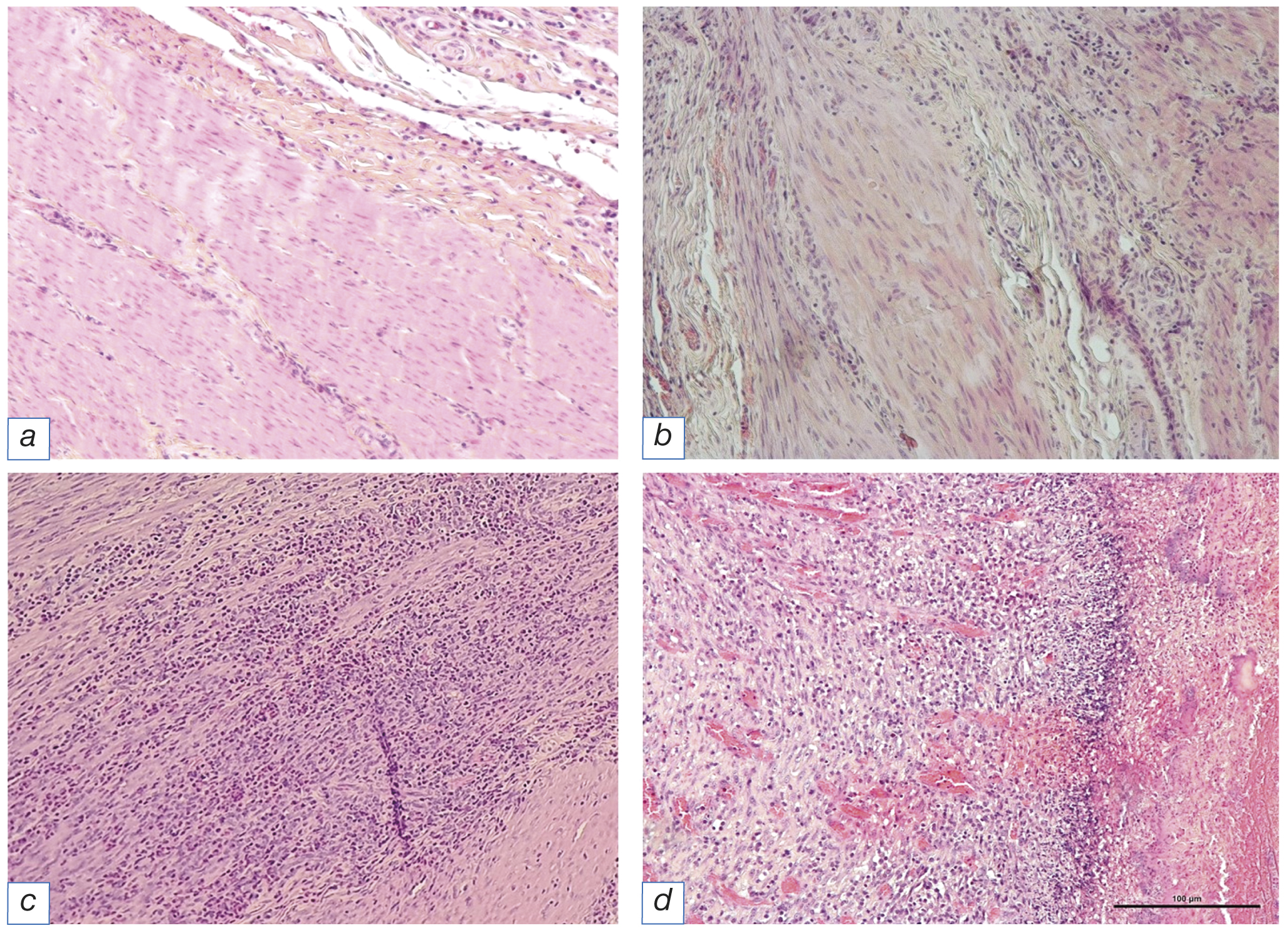 The histological slides were prepared and examined using the standard method of hematoxylin-eosin staining and the Mallory staining. A combined pathomorphological analysis was carried out with the evaluation of the acute inflammation, including its intensity and cell composition, the dystrophic changes in the parenchymal and stromal cells and the impaired circulation.