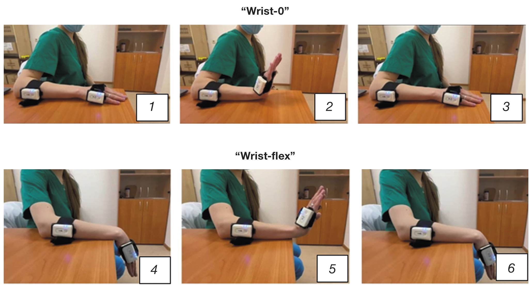 Fig.1. The attachment of the sensors to the upper limb: “Wrist-0” test (1 — positioning of the upper limb before the movement initiation; 2 — positioning with wrist extension; 3 — upper limb position at the end of the motion cycle) and the “Wrist-flex” test (4 — positioning of the upper limb before the movement initiation; 5 — maximal wrist extension position; 6 — positioning of the upper limb at the end of motion cycle).