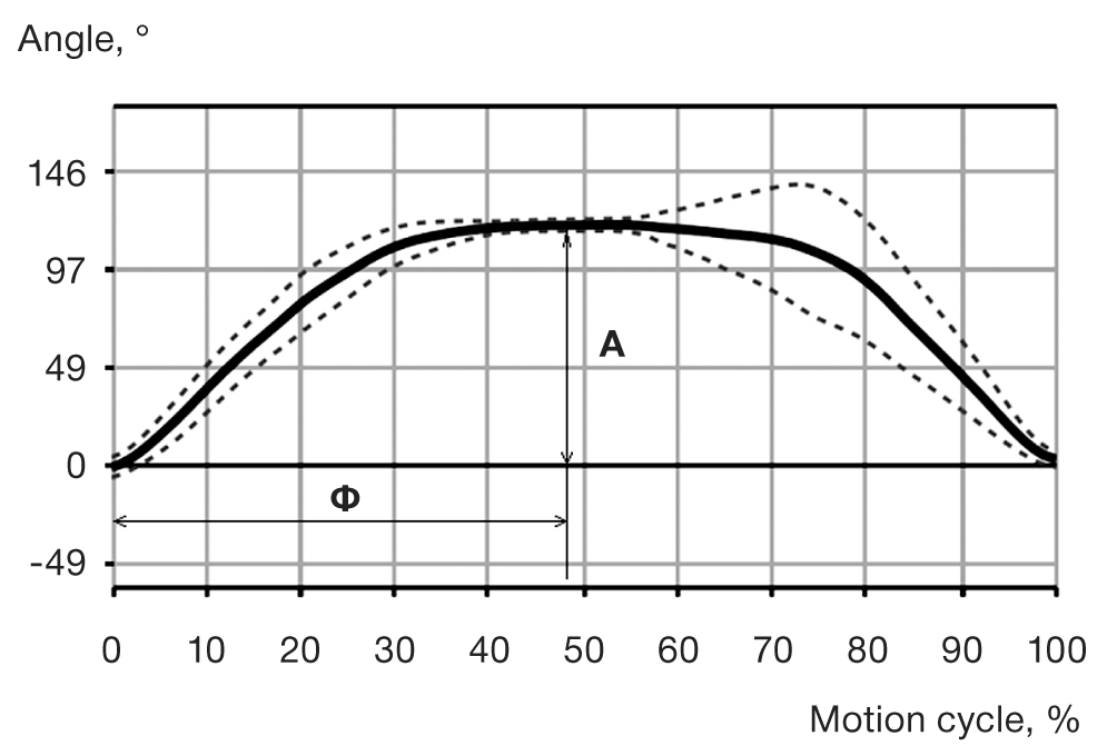 Fig.2. Goniogram: А — motion amplitude; Ф — maximal angle phase of the flexion (within the complete motion cycle).