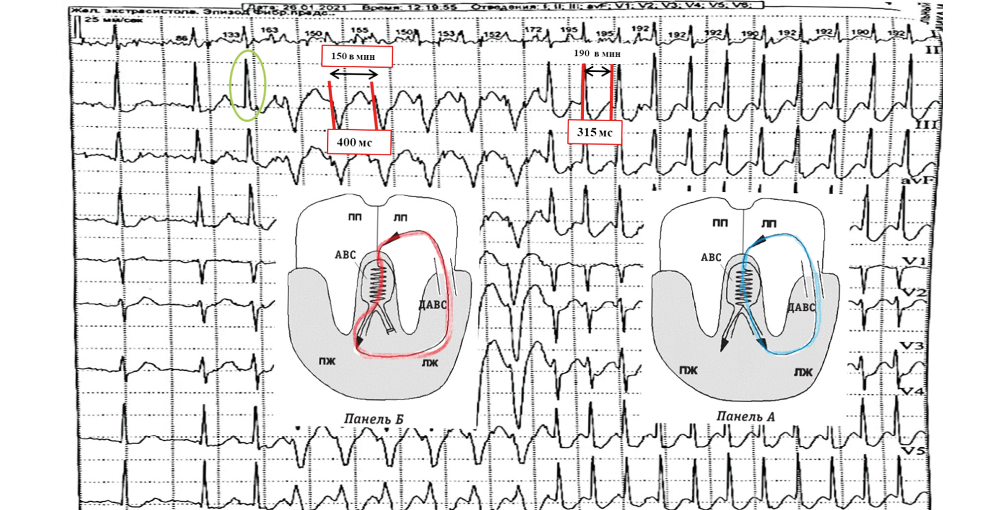 Одним из условий возникновения ортодромной АВРТ и реализации механизма риэнтри является наличие двух разнородных путей проведения — быстрый (ДАВС) и медленный атриовентрикулярный узел. В понятие «быстрый» и «медленный» путь вкладывают скорость распространения волны деполяризации по проводящей системе миокарда. Эктопический водитель ритма, в данном случае предсердная экстрасистола, блокирует быстрый путь проведения, вследствие чего фронт возбуждения из синусового узла антеградно проводится только по атриовентрикулярному соединению на проводящую систему ножек пучка Гиса, тем временем ДАВС находится в рефрактерном периоде. В то время как импульс проходит по «медленному» атриовентрикулярному узлу, проведение по «быстрому» ДАВС восстанавливается (дополнительный путь проведения выходит из состояния рефрактерности). Возбуждение, следуя по проводящей системе ножек пучка Гиса, проводится ретроградно по ДАВС на предсердия с реализацией механизма риентри и регистрацией на поверхностной ЭКГ ортодромной АВРТ [5–8] (рис. 2, панель А). Однако в нашем случае «узкокомплексной» тахикардии предшествует «ширококомплексная» тахикардия по типу блокады левой ножки пучка Гиса, что объясняется наличием ипсилатерального блока, который определяют как блокаду ножки пучка Гиса на стороне расположения ДАВС (рис. 2, панель Б).