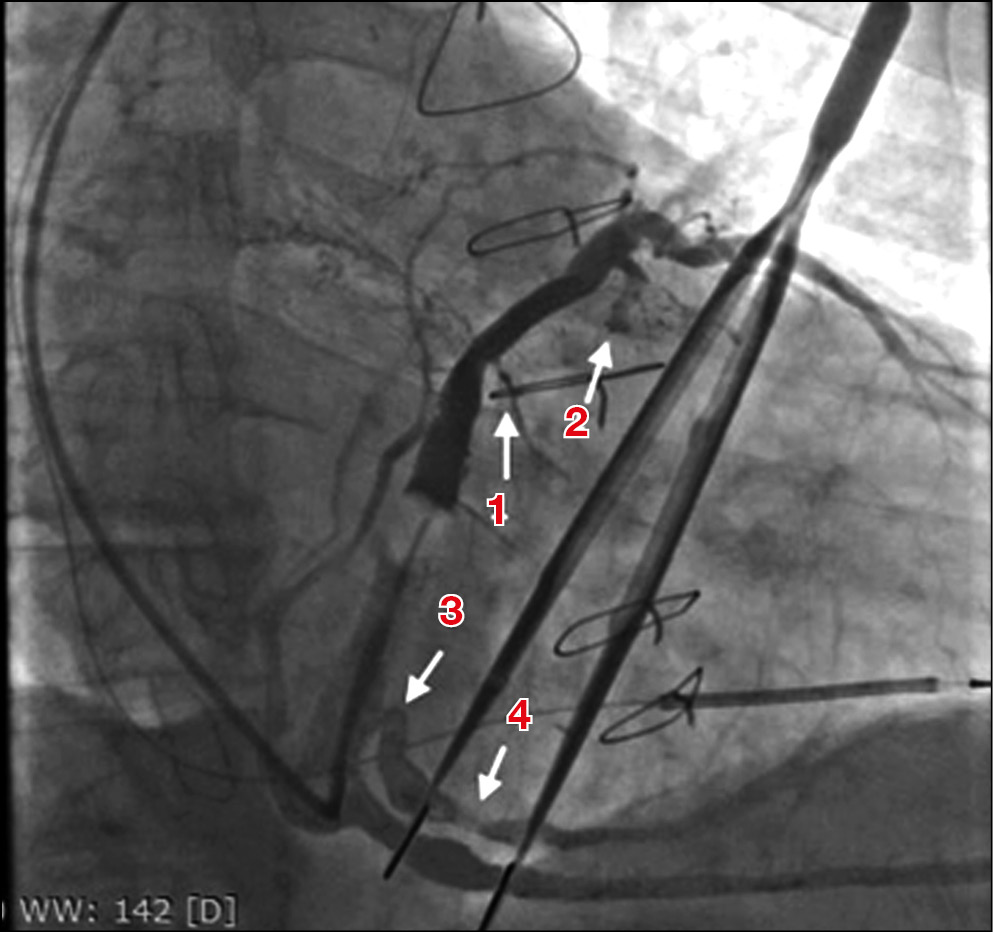 Рис. 1. Интраоперационное контрастирование венозной системы сердца (правая косая проекция, 30°): 1 — нитевидная латеральная вена сердца; 2 — переднелатеральная вена сердца, нитевидно сужающаяся через 1,5–2 см от устья; 3 — резкий изгиб в проксимальной части заднелатеральной вены сердца; 4 — дефект наполнения, изменяющий свою интенсивность вместе с кардиоциклом, обусловленный, вероятно, внешним препятствием (мышечный/соединительнотканный тяж). / Fig. 1. Contrasting the cardiac veins during the operation (right anterior oblique projection, 30°): 1 — filiform lateral cardiac vein; 2 — anterolateral cardiac vein, very narrow within 1.5–2 cm from the vein orifice; 3 — sharp flexion in the proximal part of the posterolateral cardiac vein; 4 — a defect of filling in the posterolateral cardiac vein, its intensity changing with the heart cycle.