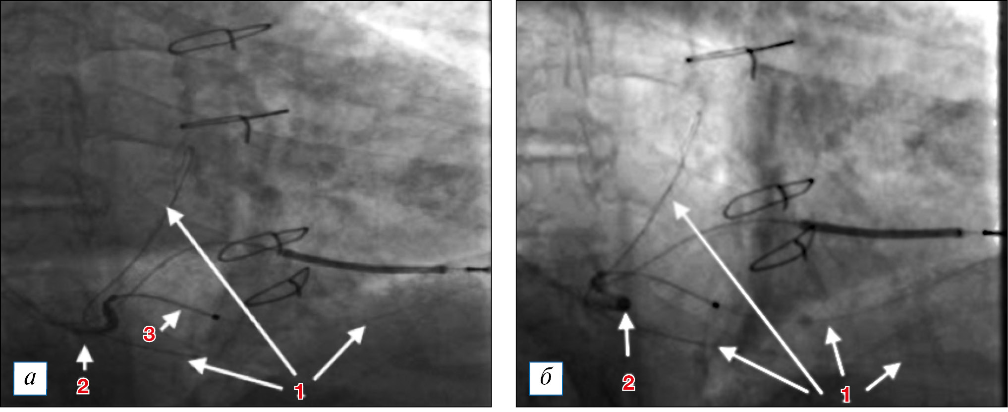 Рис. 2. Установленная система доставки. Проведение коронарного проводника в заднелатеральную вену (правая косая проекция, 30°): 1 — коронарный проводник, проведенный через селективный интродьюсер (2) в заднелатеральную вену, идущий через коллатераль в среднюю вену сердца и возвращающийся ретроградно в большую вену сердца; 2 — система доставки левожелудочкового электрода с установленным внутри селективным катетером, заходящим в устье заднелатеральной вены сердца (обращает на себя внимание выход селективного катетера из устья на панели 2б при попытке поступательного продвижения электрода по коронарному проводнику); 3 — электрод, проводимый по коронарному проводнику. / Fig. 2. Positioning the left ventricular lead delivery system into the coronary sinus. Passage of the coronary guidewire into the posterolateral vein (right anterior oblique projection, 30°): 1 — coronary guidewire has been introduced into the posterolateral vein with the help of a subselective catheter (2). The guidewire went through the collateral vein into the middle cardiac vein and returned in a retrograde manner to the great cardiac vein; 2 — the left ventricular lead delivery system with a subselective catheter inside. The tip of the subselective catheter was localized in the orifice of the posterolateral vein. It is remarkable, that during the attempts of pushing the left ventricular lead along the guidewire, the subselective catheter fell out of the posterolateral vein orifice (panel 2б); 3 — the left ventricular lead, that was passed along the guidewire.