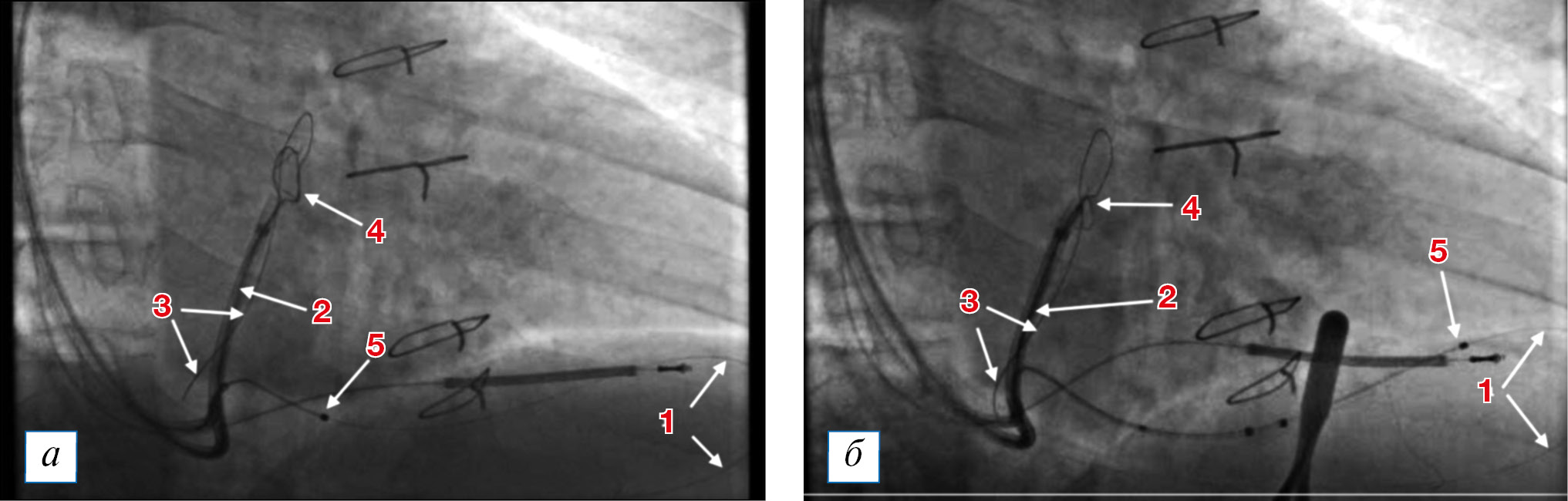 Рис. 3. Проведение левожелудочкового электрода в заднелатерельную вену сердца (правая косая проекция, 30°): 1 — коронарный проводник, проведенный в заднелатеральную вену сердца и через коллатераль уходящий в среднюю вену сердца; 2 — вторая система доставки, через которую проведена ловушка типа Goos Neck (на ее рентгенологическую тень накладывается восходящая часть коронарного проводника в большой вене сердца, который выходит из устья средней вены сердца); 3 — самая дистальная часть коронарного проводника, загибающегося в верхней части большой вены сердца и спускающегося обратно к устью коронарного синуса (на панели 3б — захвачен ловушкой в верхней части); 4 — ловушка типа Goos Neck, проведенная по второй системе доставки (на панели 3а — в распущенном состоянии, на панели 3б — захватывающая коронарный проводник в большой вене сердца, формируя замкнутую петлю коронарного проводника, идущего через заднелатеральную вену сердца, коллатераль, среднюю вену сердца); 5 — дистальный конец левожелудочкового электрода (на панели 3а — в проксимальной части заднелатеральной вены, на панели 3б — в дистальной части заднелатеральной вены в области латеральной стенки левого желудочка). / Fig. 3. Passage of the left ventricular lead into the posterolateral cardiac vein (right anterior oblique projection, 30°): 1 — coronary guidewire is in the posterolateral cardiac vein and is going through the collateral to the middle cardiac vein; 2 — the second left ventricular lead delivery system was positioned in the great cardiac vein. Within the second delivery system, the goose neck snare was introduced. The X-ray shadow of the snare overlaps with the shadow of the ascending part of the guidewire in the great cardiac vein; 3 — the most distal part of the guidewire folded in the upper part of the great cardiac vein and descending back to the coronary sinus ostium (in the 3-rd panel, the capture of the guidewire by the snare is shown); 4 — the goose neck snare is in the second lead delivery system (in panel 3а, the snare is relaxed, in panel 3б, the snare is tightened, the guidewire was captured with the formation of a closed loop, going through the posterolateral cardiac vein, collateral vein and middle cardiac vein); 5 — the distal tip of the left ventricular lead (in panel 3а — the lead tip is in the proximal part of the posterolateral vein, in panel 3б — the lead tip is in the distal part of the posterolateral vein).
