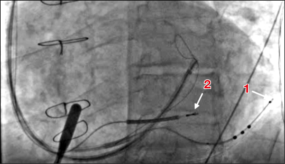 Рис. 4. Позиционированные правожелудочковый и левожелудочковый электроды в левой косой (30°) проекции: 1 — дистальный конец левожелудочкового электрода, располагающийся практически в средней трети латеральной стенки левого желудочка; 2 — дистальный конец правожелудочкового электрода, установленного в верхушку сердца (верхушечная часть межжелудочковой перегородки). / Fig. 4. The right ventricular lead and the left ventricular lead it the end of the operation (left anterior oblique, 30°): 1 — the distal tip of the left ventricular lead is in the middle part of the lateral ventricle wall; 2 — the distal tip of the right ventricular lead is in the heart apex.