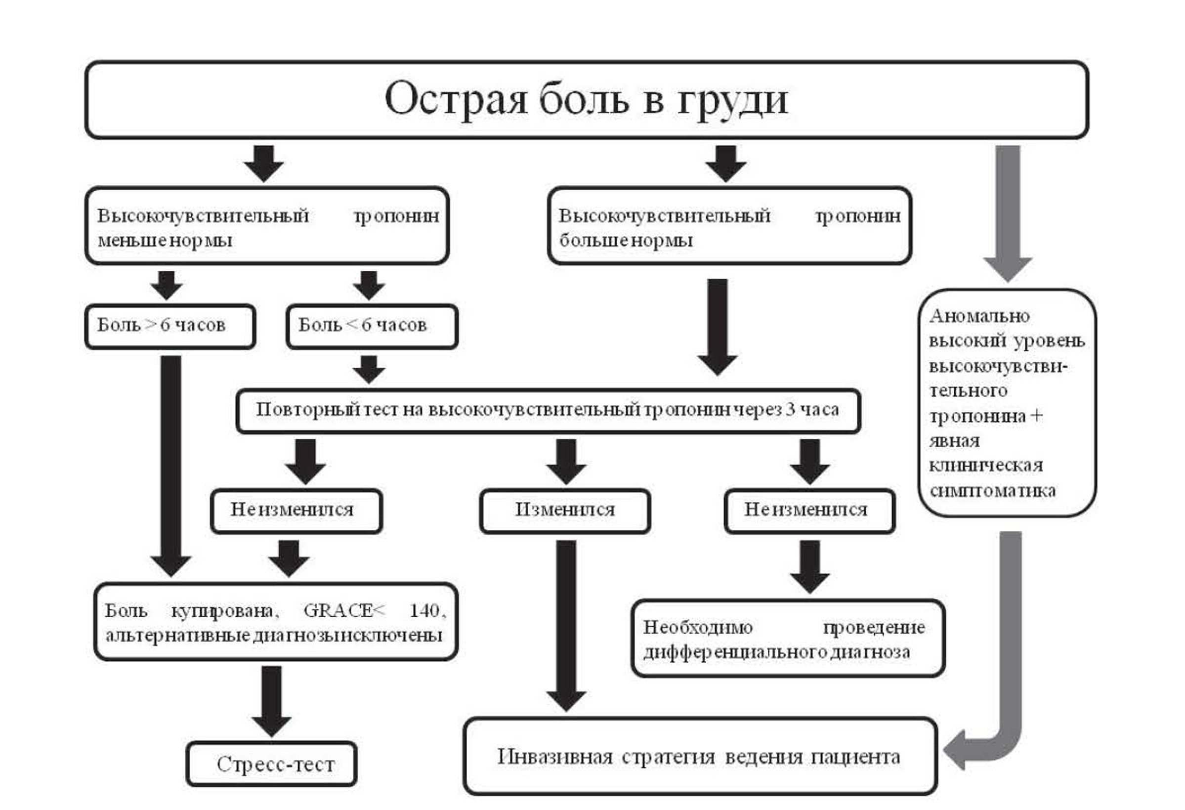 Рис. 1. «0/3» часовой алгоритм ведения пациентов с ОКСбпST с использованием высокочувствительных тропонинов [1].