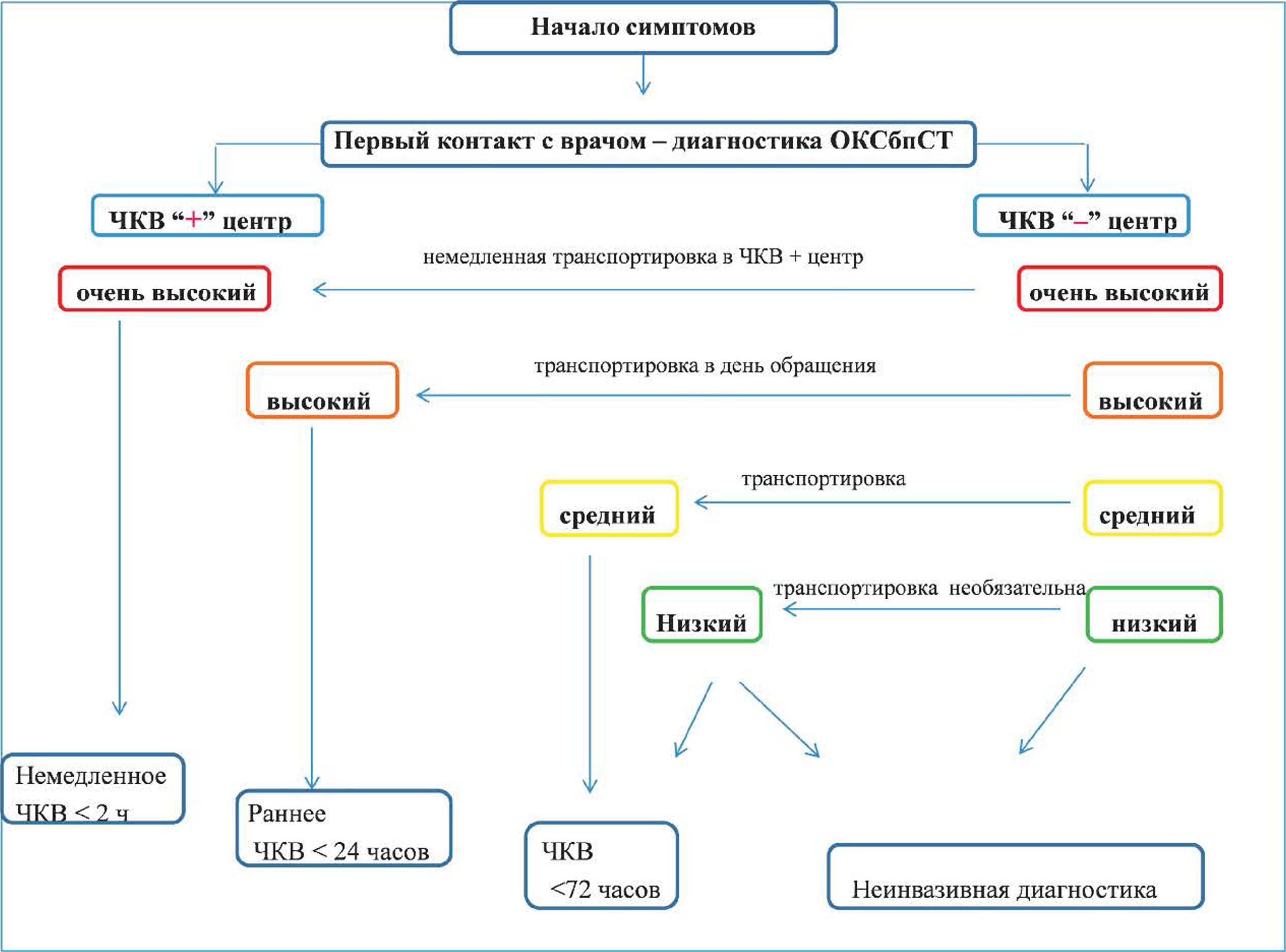 Если у пациентов с OKCcпST тактика заключается в немедленной (как только возможно быстрой) реперфузии миокарда с помощью первичного чрескожного коронарного вмешательства (ЧКВ) или фибринолитической терапии, то пациенты с OKC6пST представляют более разнородные группы, в отношении которых интенсивность и сроки вмешательства выбираются с учетом оценки индивидуального риска (на основе шкал GRACE или TIMI) [1].