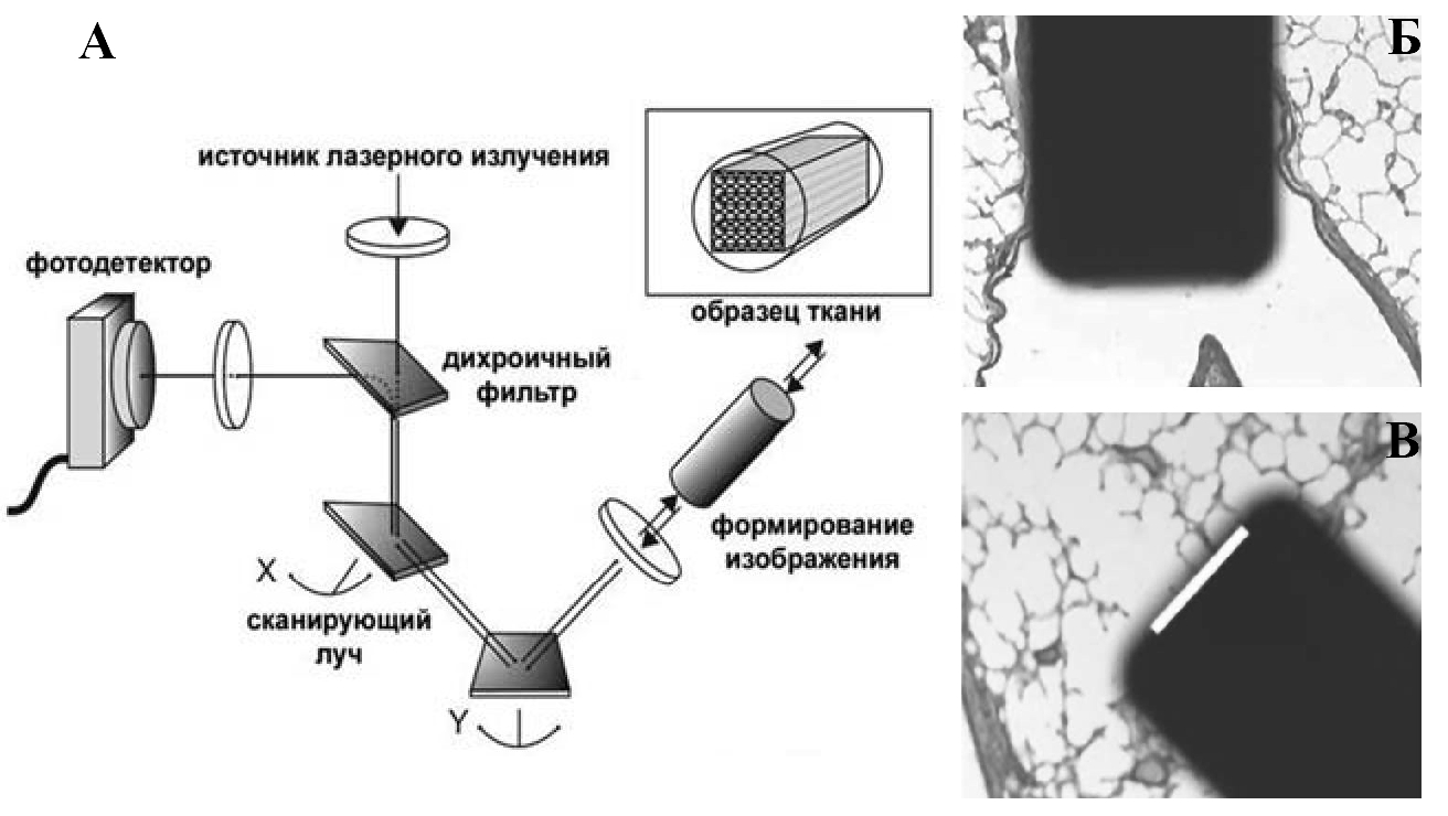 Метод КЛЭМ основан на принципе конфокальной флюоресцентной микроскопии [3-5]. Лазер с длинной волны 488 нм, расположенный в рабочей станции, генерирует лазерный луч и передает его с помощью систем зеркал, качающихся во взаимоперпендикулярных направлениях, На выходе из рабочей станции лазерный луч проходит через многоволоконный фиброоптический зонд и попадает на поверхность исследуемой ткани. Часть света поглощается, а индуцируемый лазером эффект флюоресценции вызывает свечение тканей, которое идентифицируется конфокальным микроскопом, обрабатывается компьютером, позволяя получить динамическое монохромное изображение на мониторе (рис. 1) [6].