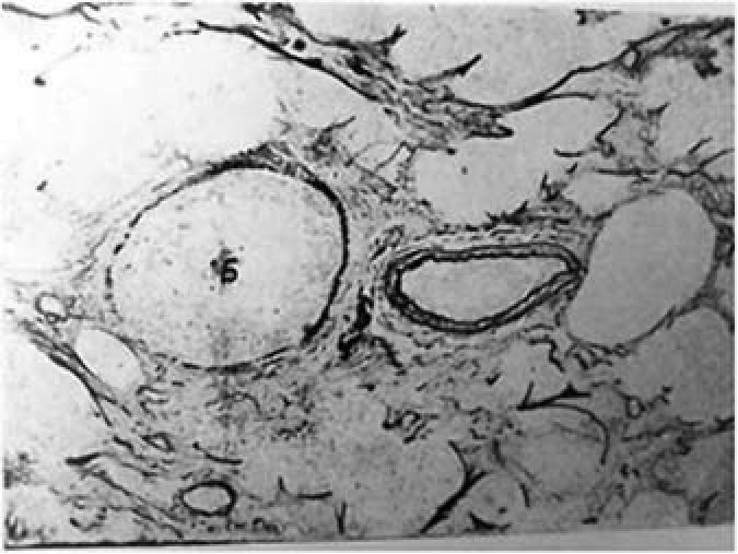 б. Альвеаскопия. Участок дистелектаза. Виден нарушенный "рельеф" строения и расположения эластиновых волокон
