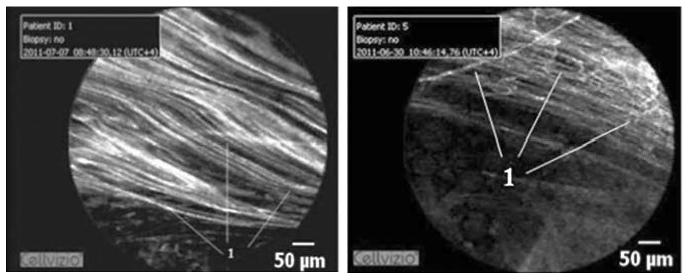 При изучении изображений КЛЭМ мы отметили повторяющиеся структуры овальной или округлой формы, не меняющие своего размера, средним диаметром около 200 микрон, что соответствует вестибулярному отделу респираторной бронхиолы 3-го порядка. Важным моментом, позволяющим нам обосновать это суждение, является то, что вслед за изображением стенки бронхиолы при проведении датчика в дистальном направлении визуализируются ячеистые структуры, представленные взаимопересекаемыми волокнами эластина, что довольно часто предваряется овальной структурой, являющейся, судя по всему, вестибулярным отделом или «альвеолярным ртом» (рис. 3).