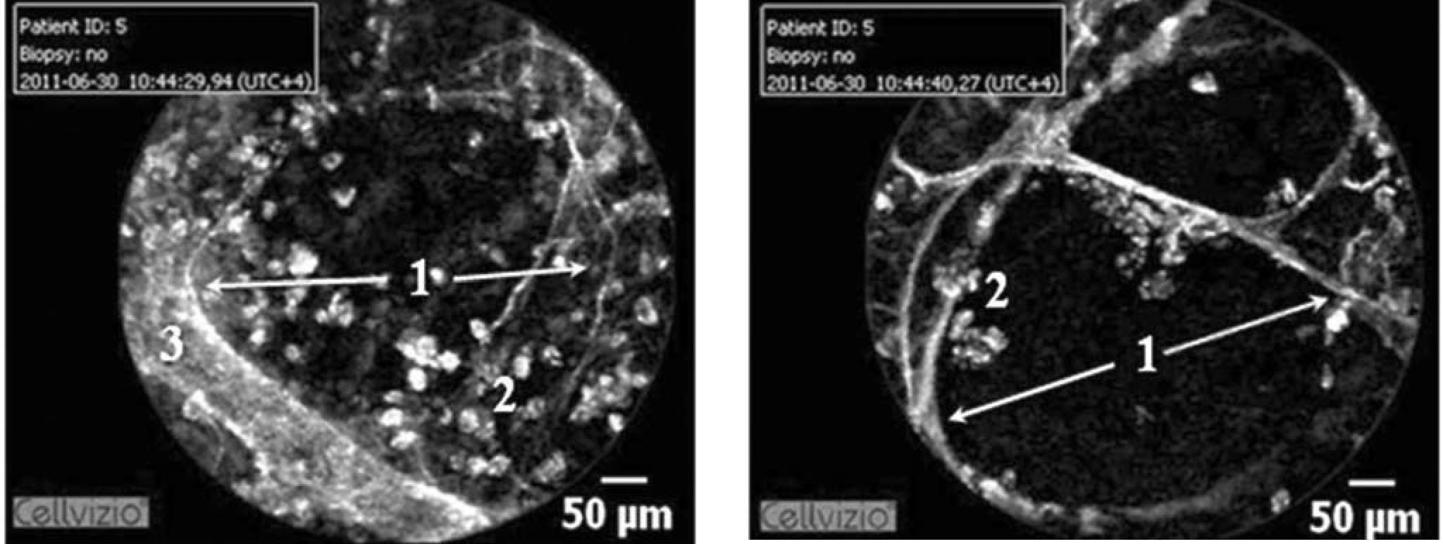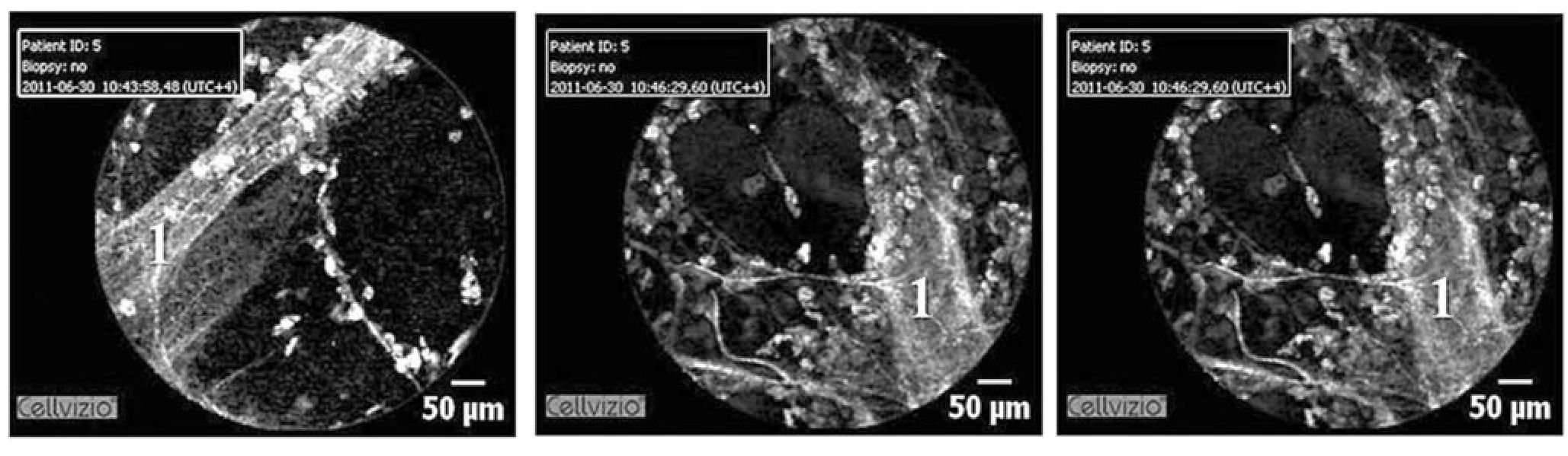 времени сделать предварительное заключение. Вслед за этим исследователь выполняет щипцовую биопсию для верификации диагноза на патоморфологическом уровне. Представляется перспективным использование специального набора, включающего в себя тонкие щипцы и катетер, через который последовательно можно провести зонд Alveoflex для предварительной зоны оценки последующей биопсии, а затем - цапку для забора материала. Это позволит прецизионно сопоставить данные при КЛЭМ и гистологическом исследовании и увеличить диагностическую ценность новой методики.