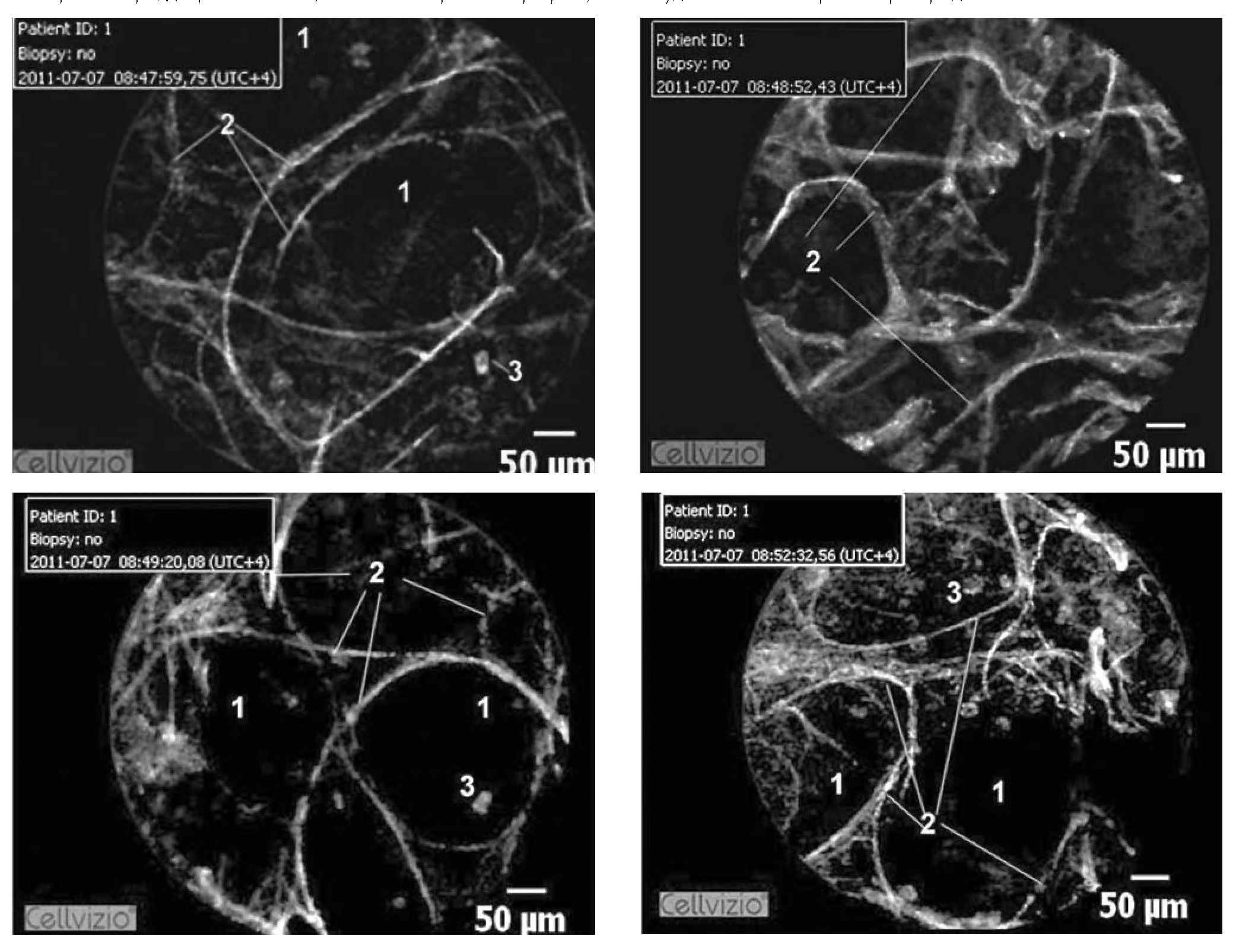 Капилляры (1) ацинарного аппарата представлены хорошо выраженными продольно ориентированными структурами, имеющими дихотомическое- ветвление, включают в себя эластиновый компонент. Изменения диаметра в зависимости от фаз дыхания не обнаружено. Изначальная версия о возможности определения кровотока нами не была подтверждена, вероятно, это обусловлено различием спектров накопления эритроцитов.