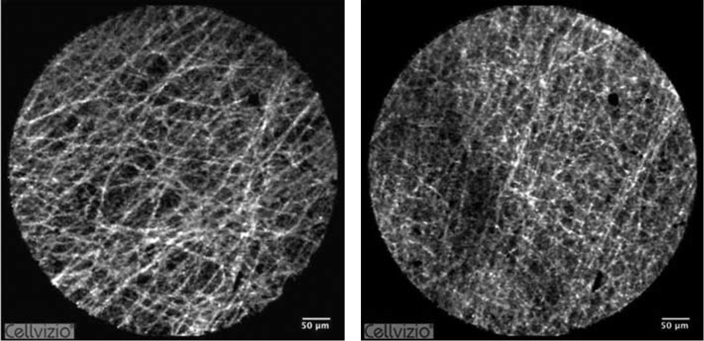 Во-первых, стандартная КЛЭМ позволяет визуализировать лишь те элементы, которые имеют собственную аутофлюоресценцию, а их не так много: альвеолярные макрофаги, эластические волокна, сосуды, некоторые белковые включения.