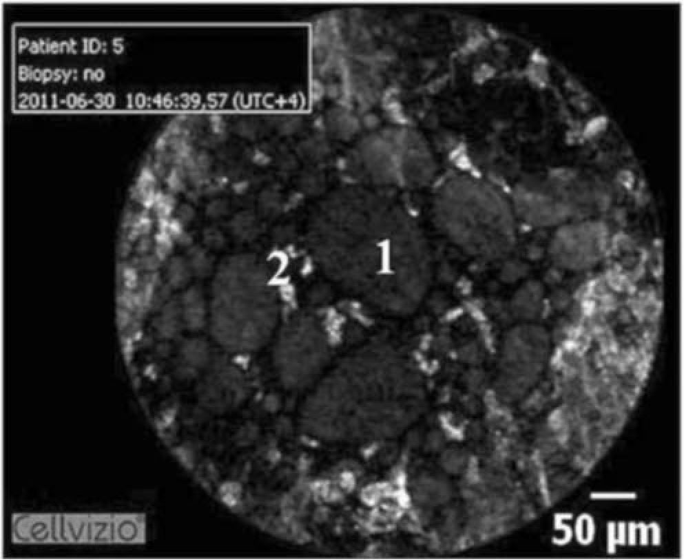Рис. 8. Альвестскопия. Видны капельки секрета (1)и макрофаги (2) в просвете альвеолы