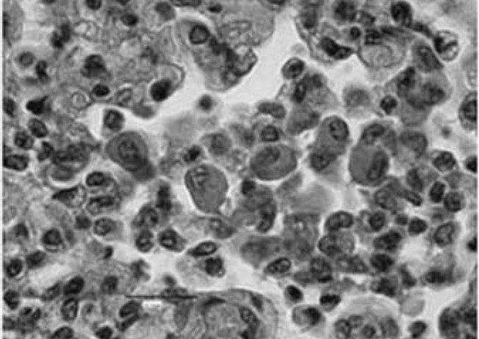 Рис. 9.а. Макрофаги в просветах альвеол. Полутонкий срез, окраска азуром II, х800 [14]