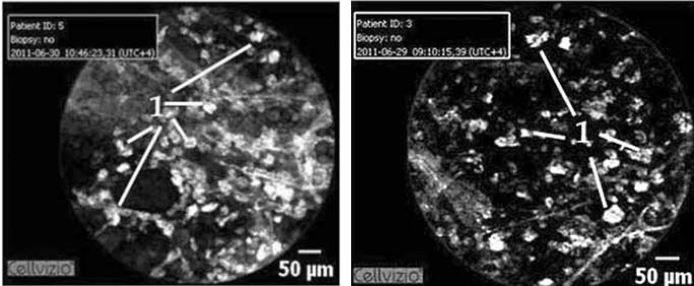 Во время видеобронхоскопии всем пациентам было выполнено последовательное посегментное исследование респираторных отделов с помощью зонда Alveoflex и осуществлены видеозаписи и фотографирование. В дальнейшем мы пытались оценить полученные изображения по ряду ниже приведенных параметров: