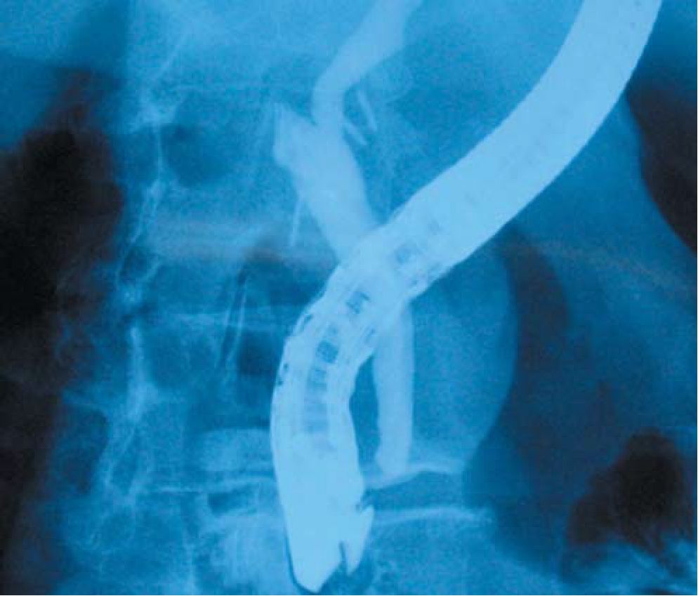 При наличии в анамнезе или в момент поступления у больного симптомов желтухи и холангита, а также при регистрируемом повышении уровня билирубина и трансаминаз, необходимо выполнить эндоскопическую ретроградную панкреатохолангиографию. Она дает информацию о характере желтухи, наличии конкрементов в гепатикохоледохе, особенностях анатомии желчных протоков, наличии холецистохоледохеального или билиодигестивного свищей (рис. 4).