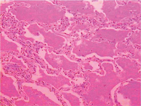 Стенки альвеол тонкие, обычного строения. В одном из кусочков легкого в просветах альвеол скопление гомогенных зернистых Масс, среди которых встречаются отдельные игольчатые структуры, пролиферация нескольких альвеолоцитов 2 типа.