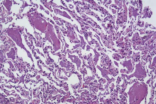 При патолого-анатомическом исследовании отмечается гиперплазия альвеолоцитов 2-го типа. В альвеолах содержится материал, который представляет собой сурфактантоподобное вещество. Это фосфолипиды, дающие яркий пурпурный цвет при окрашивании реактивом Шиффа (ШИК-реакция) (рис.1). Изменения выявляют преимущественно в субплевральных отделах легких. Характерна неравномерность поражения: часть альвеол может быть заполнена белковолипоидным материалом, а соседние участки могут оставаться интактными. Структура альвеол и межальвеолярных перегородок не нарушена [3].