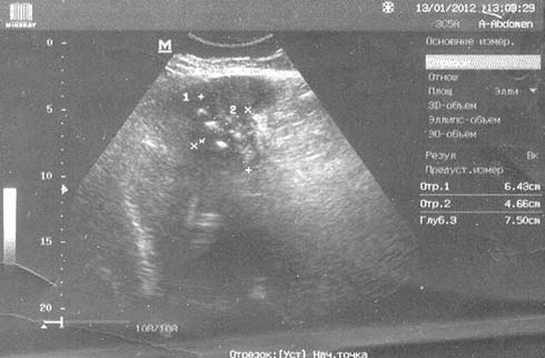 При УЗИ органов брюшной полости (17.01) желчный пузырь в инфильтрате, в области шейки фиксированный конкремент, неравномерное утолщение стенок желчного пузыря. Весь просвет пузыря заполняют множественные конкременты. Признаки диффузных изменений паренхимы печени и поджелудочной железы. Жидкости, увеличенных лимфоузлов в воротах печени нет. Заключение: ЖКБ, острый холецистит, инфильтрат желчного пузыря (рис. 1).