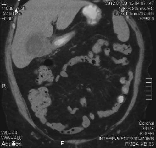 При повторной консультации хирурга (29.01), учитывая отсутствие положительной динамики при УЗИ, повышенный уровень СРБ, СОЭ в анализах для исключения опухоли желчного пузыря назначена компьютерная томография (КТ) органов брюшной полости и забрюшинного пространства. При КТ органов брюшной полости и забрюшинного пространства с контрастным усилением (30.01) в проекции желчного пузыря определяется инфильтрация печеночной паренхимы с вовлечением пузыря, стенки которого неравномерно утолщены, накапливают контрастное вещество, в просвете пузыря множественные конкременты со взвесью. Внутрипеченочные и общий желчный проток не расширены. В области ворот печени и перипузырном пространстве скудное количество жидкости. Забрюшинные лимфоузлы не увеличены. Остальные органы брюшной полости и забрюшинного пространства без особенностей. Заключение: КТ-картина требует дифференциальной диагностики между острым деструктивным холециститом и неопроцессом желчного пузыря (рис. 2).
