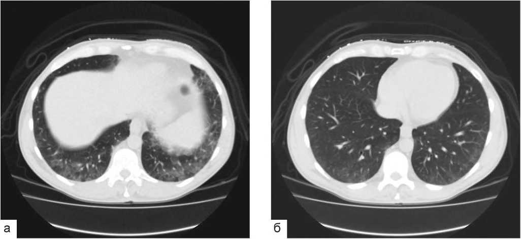 Инструментальные исследования выявили следующее. Компьютерная томография (КТ) органов грудной клетки: двусторонние интерстициальные изменения в легких («матовое стекло», утолщение междольковых перегородок) (рис. 1а, б).